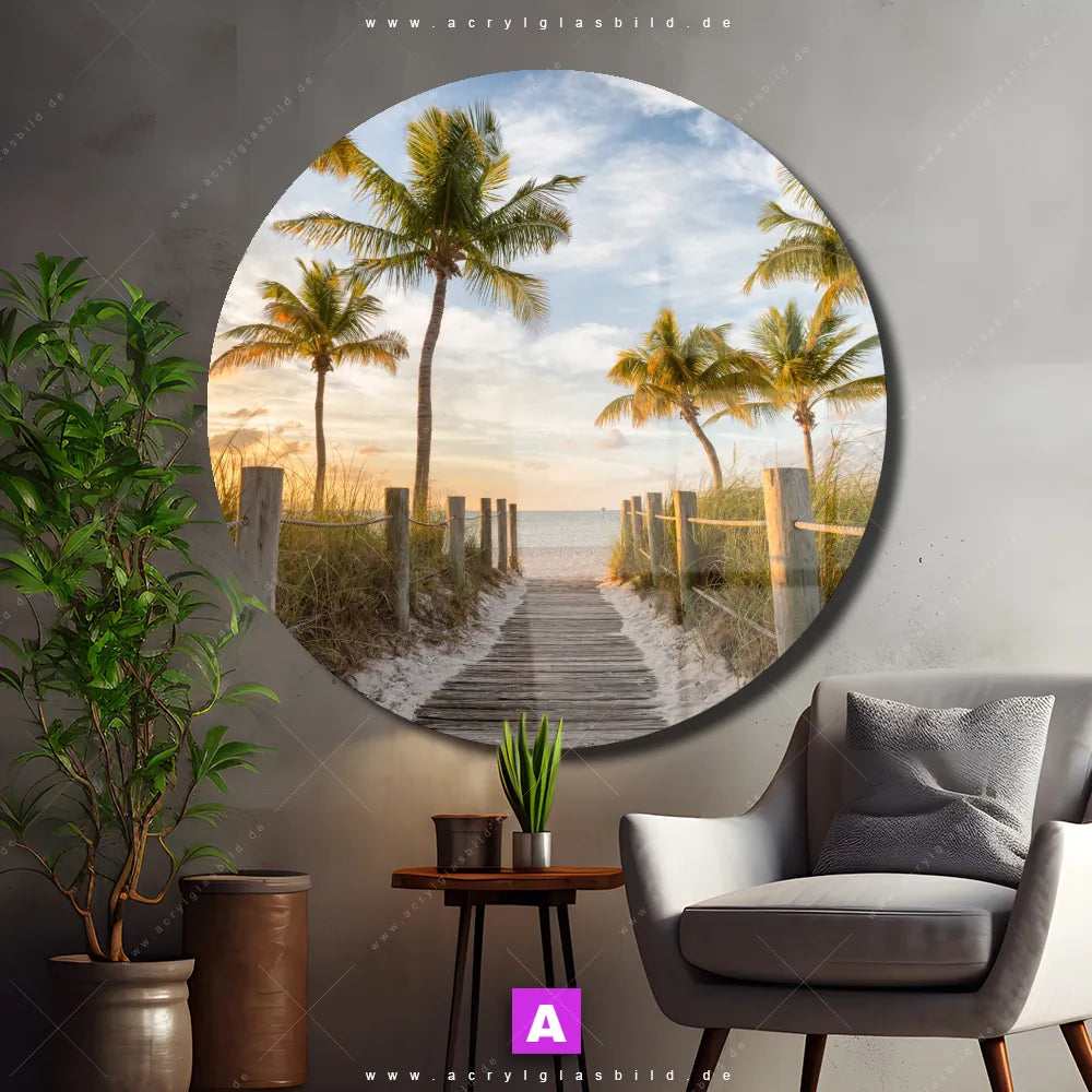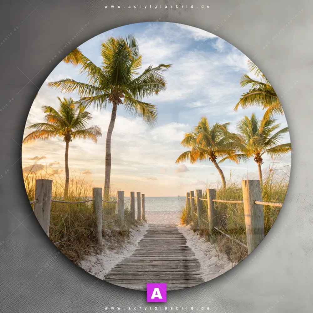 Hey du! Bist du es auch leid, auf langweilige, weiße Wände in deinem Raum zu starren und dich zu fragen, ob das der Sinn des Lebens ist? Unser Acrylglasbild mit dem Titel Palmen am Strandweg im Format Rund verwandelt deine Wand in ein Kunstwerk und macht deinen Raum zum absoluten Hingucker.
