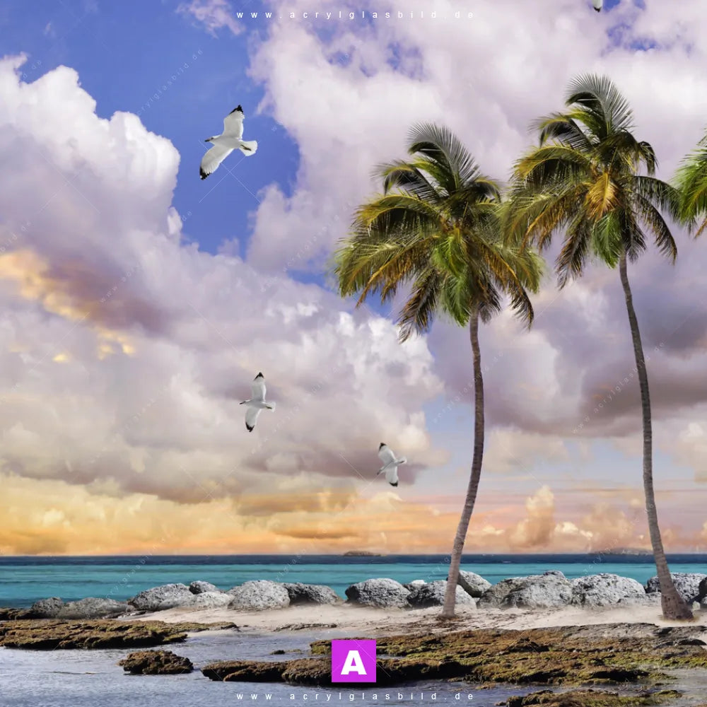 Das Beste daran ist, dass unser Acrylglasbild Palmen und Möwen am Meer im Stil Retro - Vintage perfekt zu jedem Einrichtungsstil passt. Gestaltet als Digitale Kunst, bringt es nicht nur deine Wand, sondern auch dein Herz zum Strahlen.