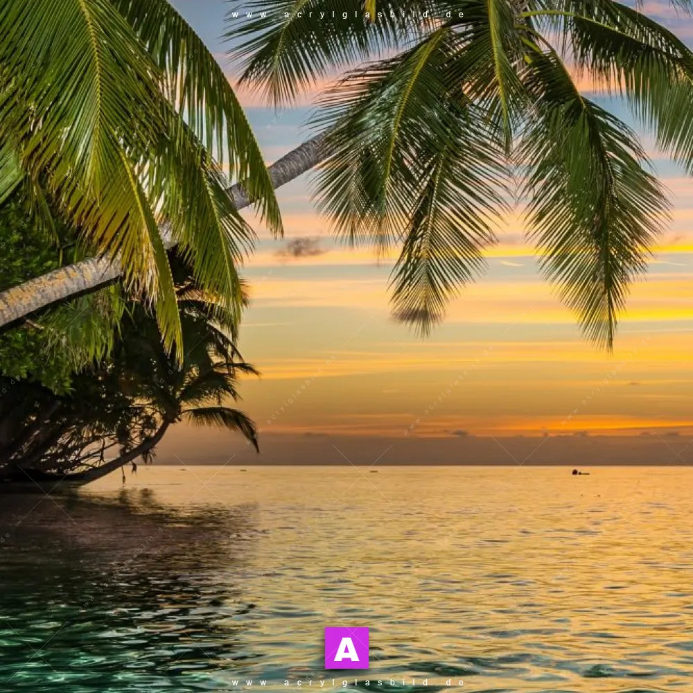 <b>Produktart:</b> Acrylglasbild | Glasbild | Wandbild aus Kunstglas | <b> Motiv:</b> Paradiesische Insel | <b> Bildausrichtung:</b> Rund | <b> Max. Motiv-Größe:</b> 360cm breit | 240cm hoch | <b> Verfügbare Formate: </b> Quadrat, Querformat, Hochformat, Panorama, Schmal, Rund | <b> Kategorie:</b> Landschaften, Strand - Meer | <b> Farben:</b> Orange, Grün, Blau | <b> Kunstformen:</b> Fotografie | <b> Kunststile:</b> Retro - Vintage, Natürlich - Realistisch