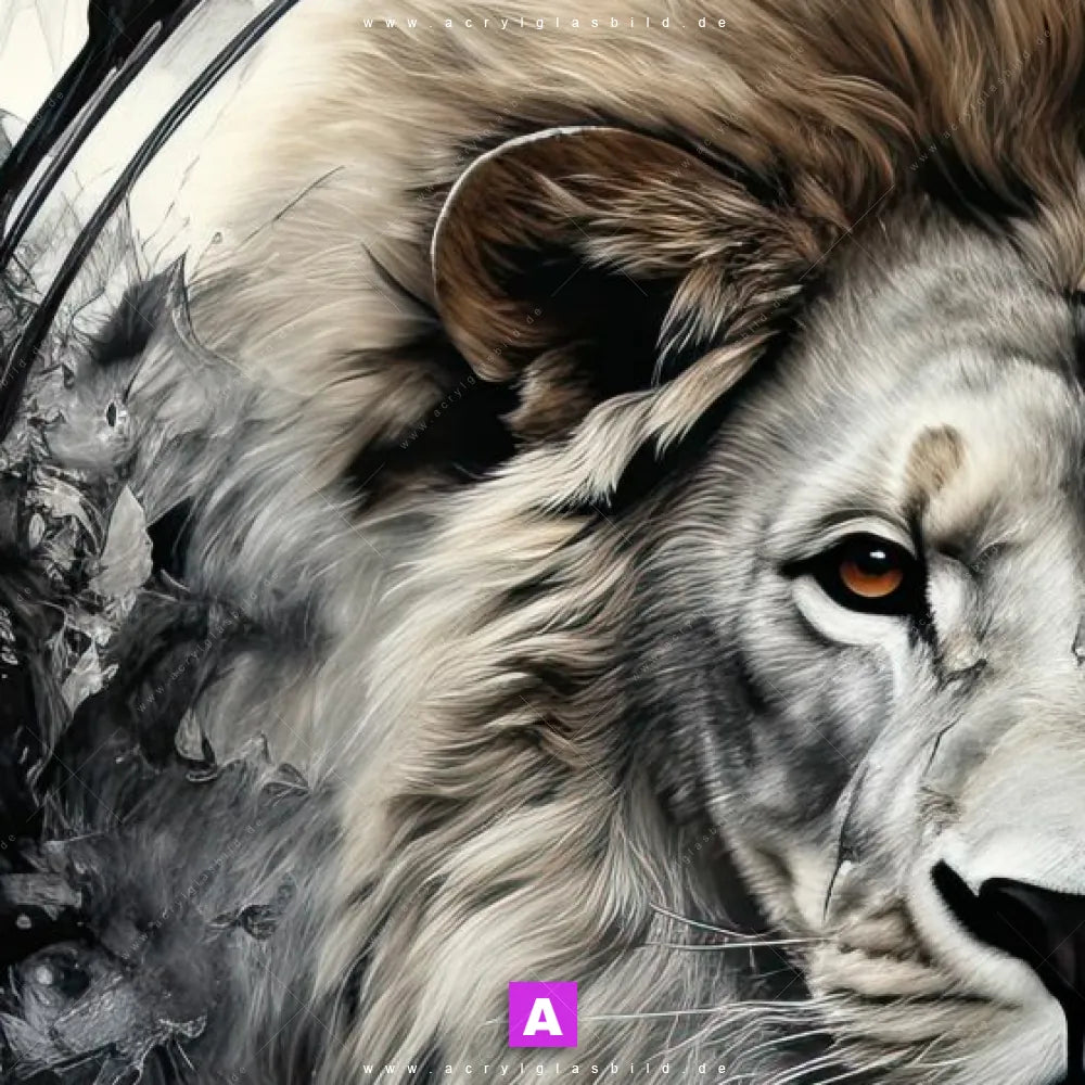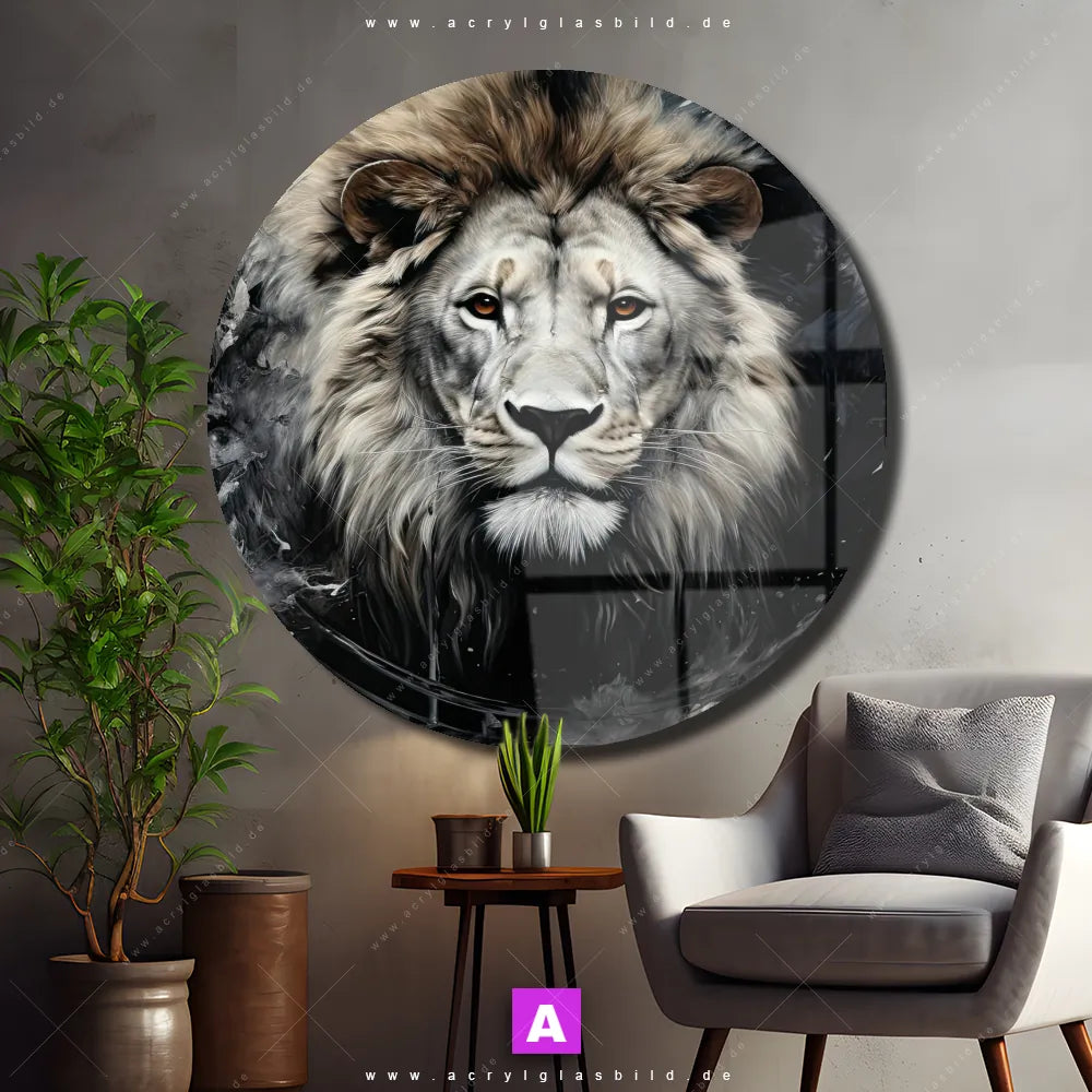 <b>Produktart:</b> Acrylglasbild | Glasbild | Wandbild aus Kunstglas | <b> Motiv:</b> Porträt eines Löwen | <b> Bildausrichtung:</b> Rund | <b> Max. Motiv-Größe:</b> 430cm breit | 240cm hoch | <b> Verfügbare Formate: </b> Quadrat, Querformat, Hochformat, Panorama, Schmal, Rund | <b> Kategorie:</b> Tierwelt | <b> Farben:</b> Schwarz, Beige | <b> Kunstformen:</b> Kunst - Malerei, Digitale Kunst | <b> Kunststile:</b> Abstrakt, Modern Art, Schwarz - Weiss