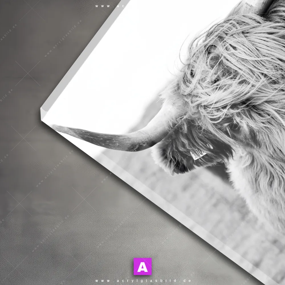 Das Motiv Rind im Hochland wird im UV-Direktdruck in den Farben Schwarz, Weiss auf die Rückseite einer 5mm starken, transparenten Acrylglasplatte gedruckt. Das durchscheinende Motiv Hochlandrind Grautöne im Natürlich - Realistisch, Schwarz - Weiss Stil wird anschließend vollflächig mit einer weißen Schicht hinterlegt. Das Tierwelt Acrylglasbild | Rund erhält so eine bemerkenswerte Farbbrillanz, hohe Schärfe und erstaunliche Tiefenwirkung.