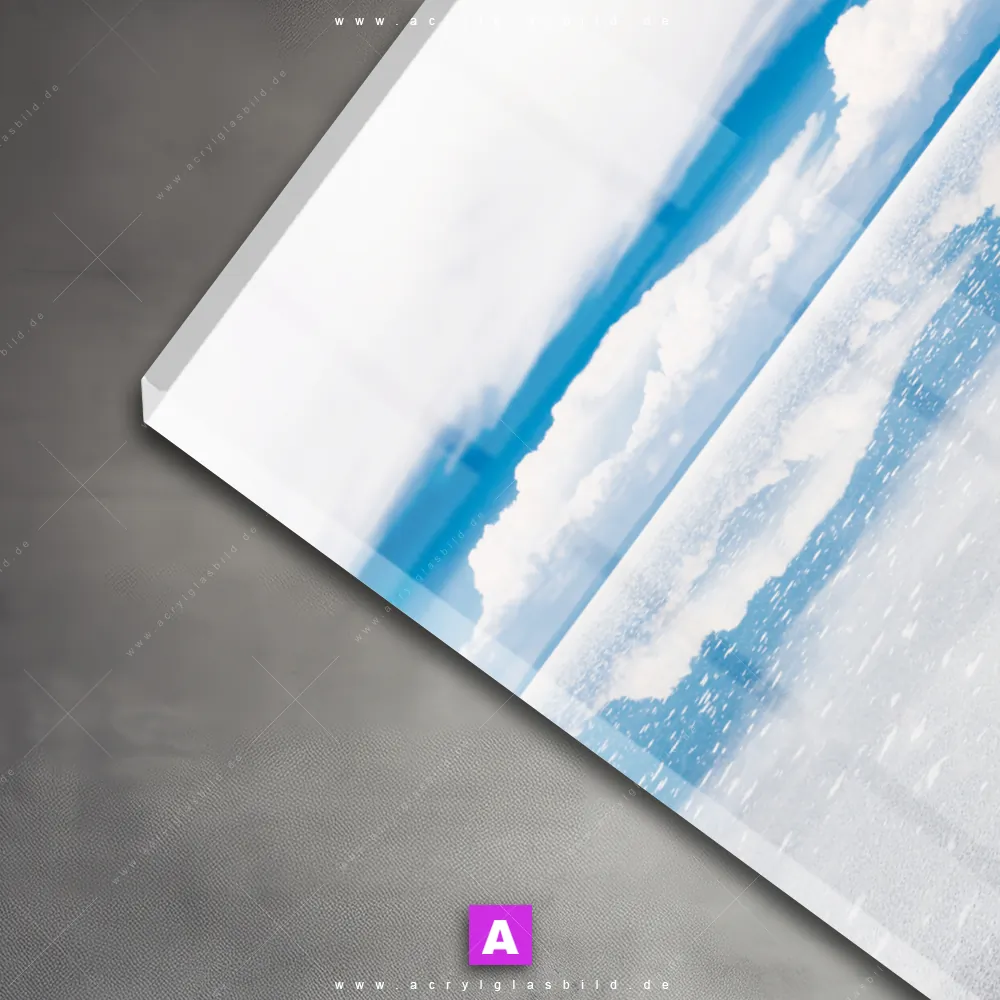 Das Motiv Salzsee in Bolivien wird im UV-Direktdruck in den Farben Weiss, Blau, Hellblau auf die Rückseite einer 5mm starken, transparenten Acrylglasplatte gedruckt. Das durchscheinende Motiv Wolken spiegeln sich im See im Natürlich - Realistisch, Minimalistisch Stil wird anschließend vollflächig mit einer weißen Schicht hinterlegt. Das Landschaften Acrylglasbild | Rund erhält so eine bemerkenswerte Farbbrillanz, hohe Schärfe und erstaunliche Tiefenwirkung.