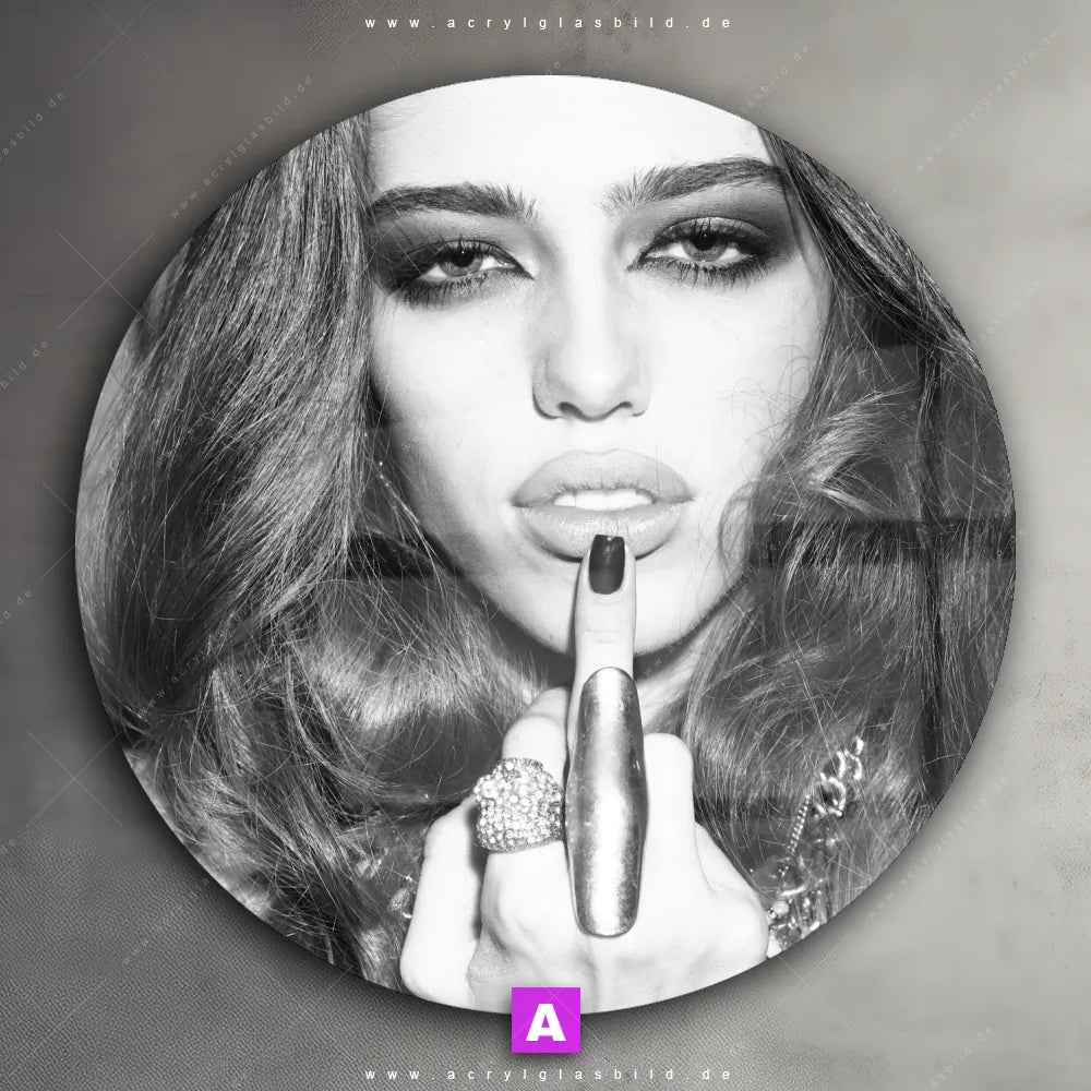 Das Motiv Schöner Mittelfinger wird im UV-Direktdruck in den Farben Schwarz, Weiss auf die Rückseite einer 5mm starken, transparenten Acrylglasplatte gedruckt. Das durchscheinende Motiv selbstbewusste Frau im Modern Art, Schwarz - Weiss Stil wird anschließend vollflächig mit einer weißen Schicht hinterlegt. Das Porträts - Menschen Acrylglasbild | Rund erhält so eine bemerkenswerte Farbbrillanz, hohe Schärfe und erstaunliche Tiefenwirkung.