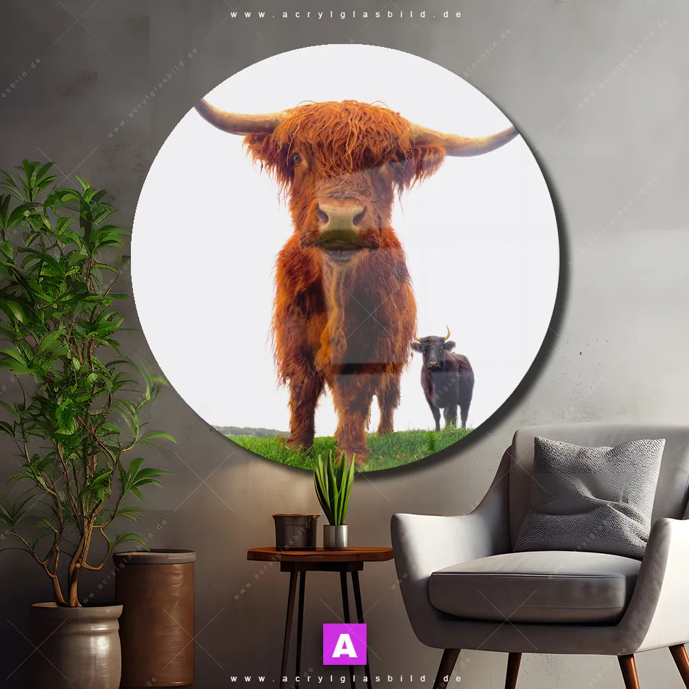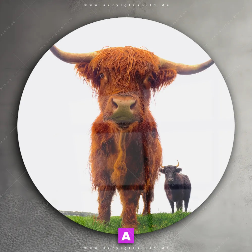<b>Produktart:</b> Acrylglasbild | Glasbild | Wandbild aus Kunstglas | <b> Motiv:</b> Schottisches Hochlandrind | <b> Bildausrichtung:</b> Rund | <b> Max. Motiv-Größe:</b> 210cm breit | 210cm hoch | <b> Verfügbare Formate: </b> Quadrat, Querformat, Hochformat, Panorama, Schmal, Rund | <b> Kategorie:</b> Tierwelt | <b> Farben:</b> Braun, Grün, Weiss | <b> Kunstformen:</b> Fotografie | <b> Kunststile:</b> Modern Art, Natürlich - Realistisch