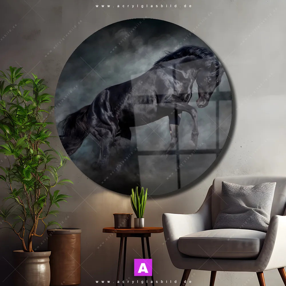 <b>Produktart:</b> Acrylglasbild | Glasbild | Wandbild aus Kunstglas | <b> Motiv:</b> Schwarzer Hengst | <b> Bildausrichtung:</b> Rund | <b> Max. Motiv-Größe:</b> 450cm breit | 300cm hoch | <b> Verfügbare Formate: </b> Quadrat, Querformat, Hochformat, Panorama, Schmal, Rund | <b> Kategorie:</b> Tierwelt | <b> Farben:</b> Weiss, Schwarz | <b> Kunstformen:</b> Fotografie, Digitale Kunst | <b> Kunststile:</b> Modern Art, Schwarz - Weiss