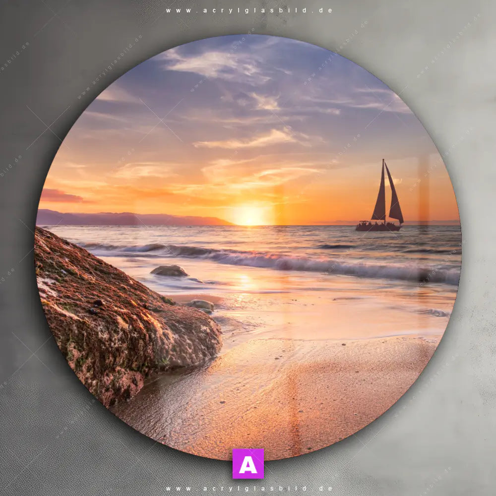<b>Produktart:</b> Acrylglasbild | Glasbild | Wandbild aus Kunstglas | <b> Motiv:</b> Segelboot im Sonnenuntergang | <b> Bildausrichtung:</b> Rund | <b> Max. Motiv-Größe:</b> 360cm breit | 240cm hoch | <b> Verfügbare Formate: </b> Quadrat, Querformat, Hochformat, Panorama, Schmal, Rund | <b> Kategorie:</b> Landschaften, Strand - Meer | <b> Farben:</b> Beige, Braun, Orange, Blau | <b> Kunstformen:</b> Fotografie | <b> Kunststile:</b> Natürlich - Realistisch