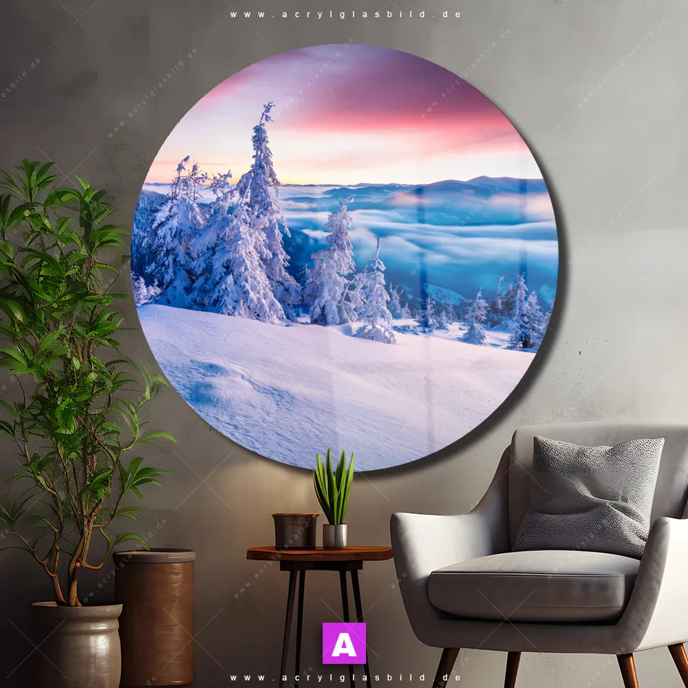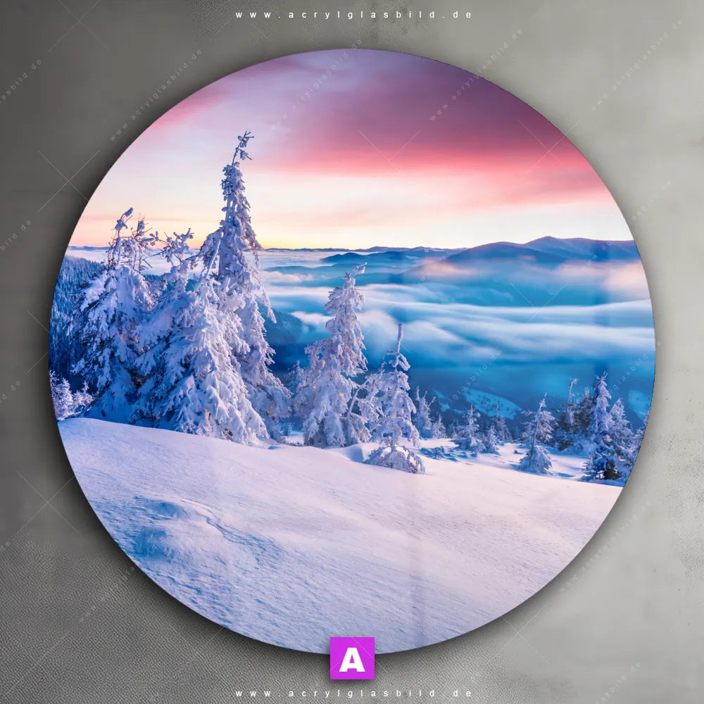 <b>Produktart:</b> Acrylglasbild | Glasbild | Wandbild aus Kunstglas | <b> Motiv:</b> Sonnenaufgang im Schnee | <b> Bildausrichtung:</b> Rund | <b> Max. Motiv-Größe:</b> 340cm breit | 250cm hoch | <b> Verfügbare Formate: </b> Quadrat, Querformat, Hochformat, Panorama, Schmal, Rund | <b> Kategorie:</b> Landschaften, Winter | <b> Farben:</b> Blau, Weiss, Hellblau, Lila, Pink, Rosa | <b> Kunstformen:</b> Fotografie | <b> Kunststile:</b> Natürlich - Realistisch