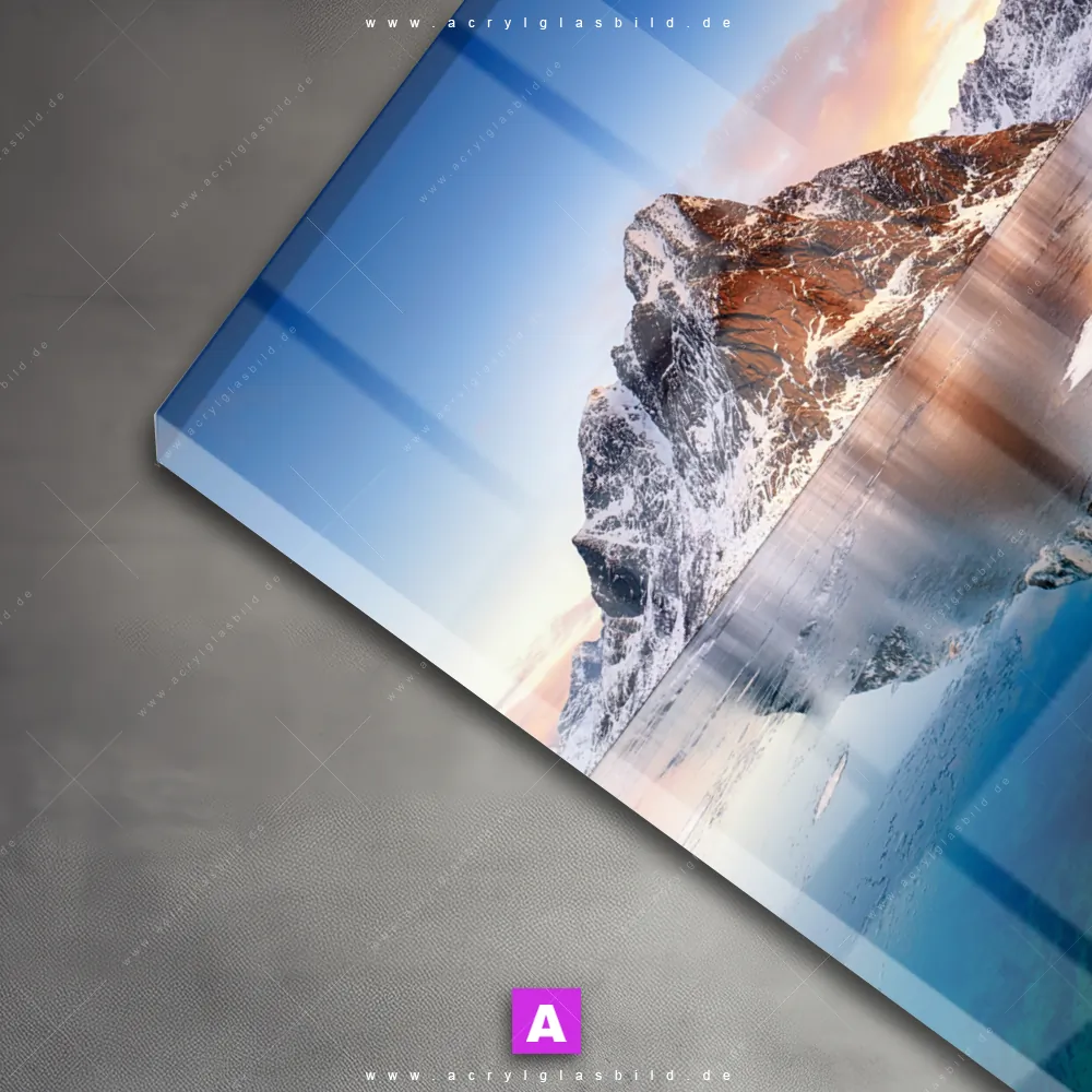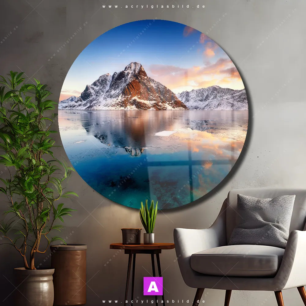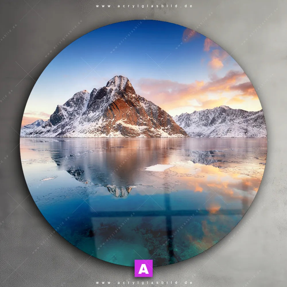 Das Motiv Sonnenuntergang Norwegen wird im UV-Direktdruck in den Farben Braun, Blau, Orange auf die Rückseite einer 5mm starken, transparenten Acrylglasplatte gedruckt. Das durchscheinende Motiv gefrorener See an den Bergen im Natürlich - Realistisch, Mixed Media Stil wird anschließend vollflächig mit einer weißen Schicht hinterlegt. Das Landschaften Acrylglasbild | Rund erhält so eine bemerkenswerte Farbbrillanz, hohe Schärfe und erstaunliche Tiefenwirkung.