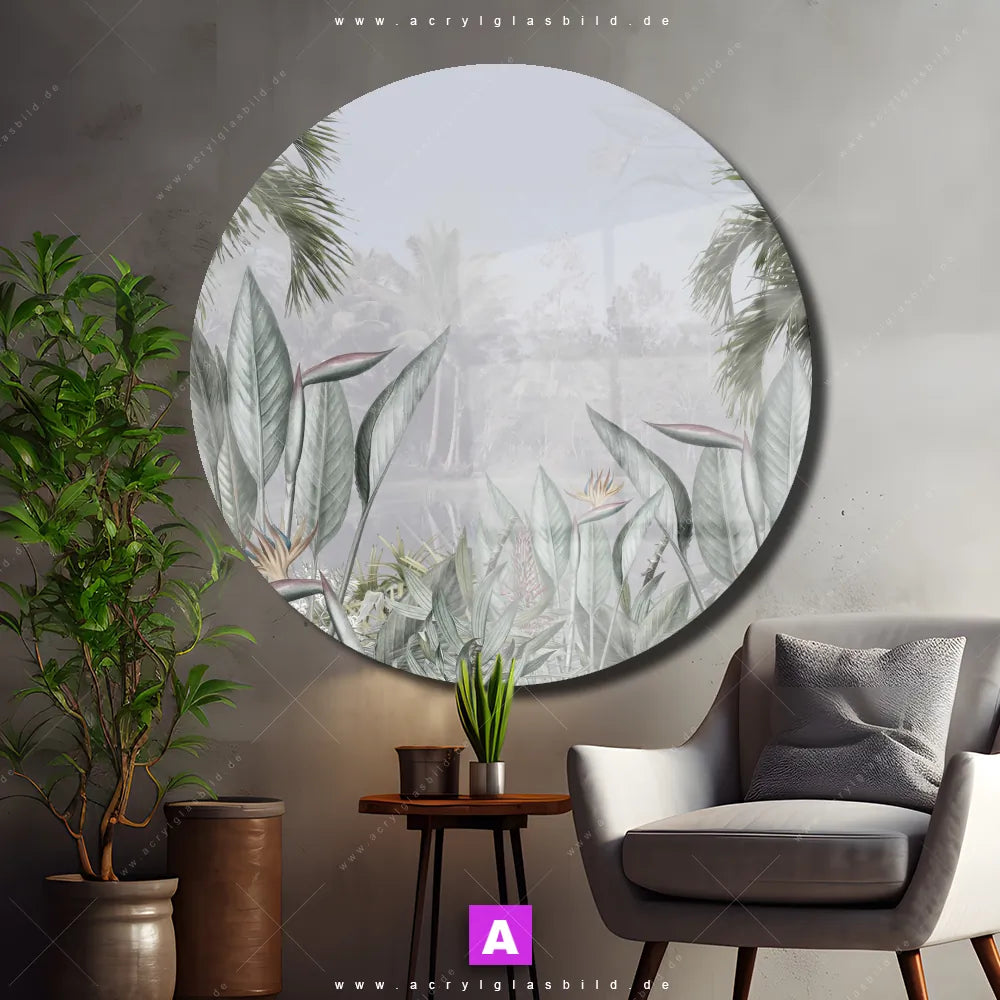 <b>Produktart:</b> Acrylglasbild | Glasbild | Wandbild aus Kunstglas | <b> Motiv:</b> Tropische Bäume und Blätter | <b> Bildausrichtung:</b> Rund | <b> Max. Motiv-Größe:</b> 370cm breit | 240cm hoch | <b> Verfügbare Formate: </b> Quadrat, Querformat, Hochformat, Panorama, Schmal, Rund | <b> Kategorie:</b> Landschaften, Wald - Bäume | <b> Farben:</b> Grün, Mint, Grau | <b> Kunstformen:</b> Digitale Kunst | <b> Kunststile:</b> Retro - Vintage