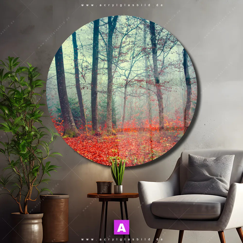 Das Motiv Verträumter Wald wird im UV-Direktdruck in den Farben Grün, Weiss auf die Rückseite einer 5mm starken, transparenten Acrylglasplatte gedruckt. Das durchscheinende Motiv rote Laubdecke vor Nebelwald im Retro - Vintage Stil wird anschließend vollflächig mit einer weißen Schicht hinterlegt. Das Landschaften, Wald - Bäume Acrylglasbild | Rund erhält so eine bemerkenswerte Farbbrillanz, hohe Schärfe und erstaunliche Tiefenwirkung.