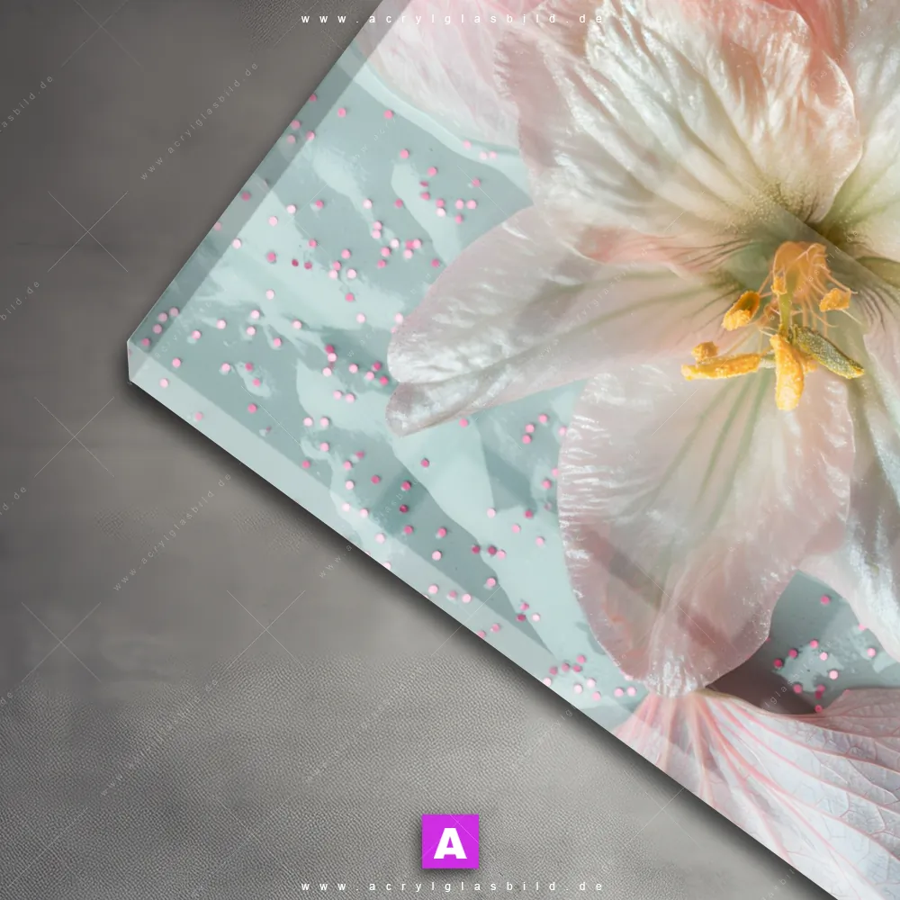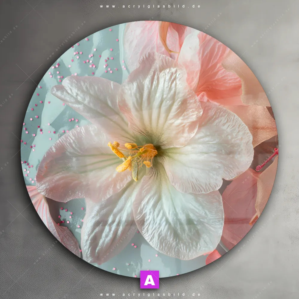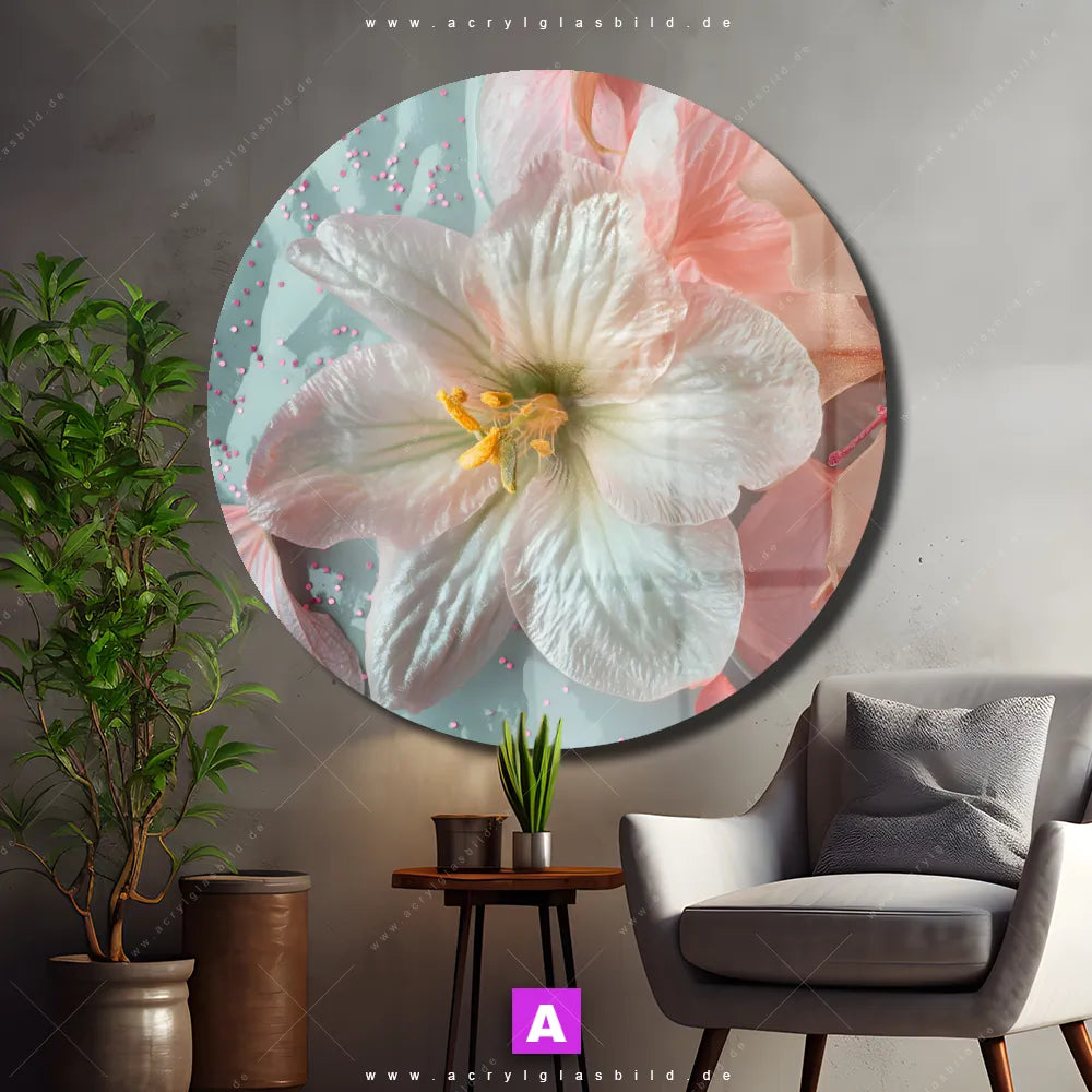 <b>Produktart:</b> Acrylglasbild | Glasbild | Wandbild aus Kunstglas | <b> Motiv:</b> Zarte Blütenpracht | <b> Bildausrichtung:</b> Rund | <b> Max. Motiv-Größe:</b> 450cm breit | 300cm hoch | <b> Verfügbare Formate: </b> Quadrat, Querformat, Hochformat, Panorama, Schmal, Rund | <b> Kategorie:</b> Blumen - Botanik | <b> Farben:</b> Rosa, Weiss, Türkis | <b> Kunstformen:</b> Digitale Kunst, Fotografie | <b> Kunststile:</b> Floral, Natürlich - Realistisch