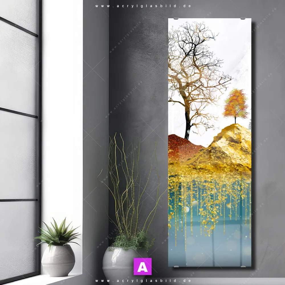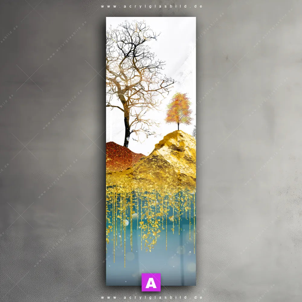 Das Motiv Abstrakte Landschaft No.1 wird im UV-Direktdruck in den Farben Weiss, Schwarz, Beige, Gold, Ocker, Orange auf die Rückseite einer 5mm starken, transparenten Acrylglasplatte gedruckt. Das durchscheinende Motiv goldener Farblauf vom Wald im Abstrakt, Modern Art Stil wird anschließend vollflächig mit einer weißen Schicht hinterlegt. Das Landschaften Acrylglasbild | Schmal erhält so eine bemerkenswerte Farbbrillanz, hohe Schärfe und erstaunliche Tiefenwirkung.