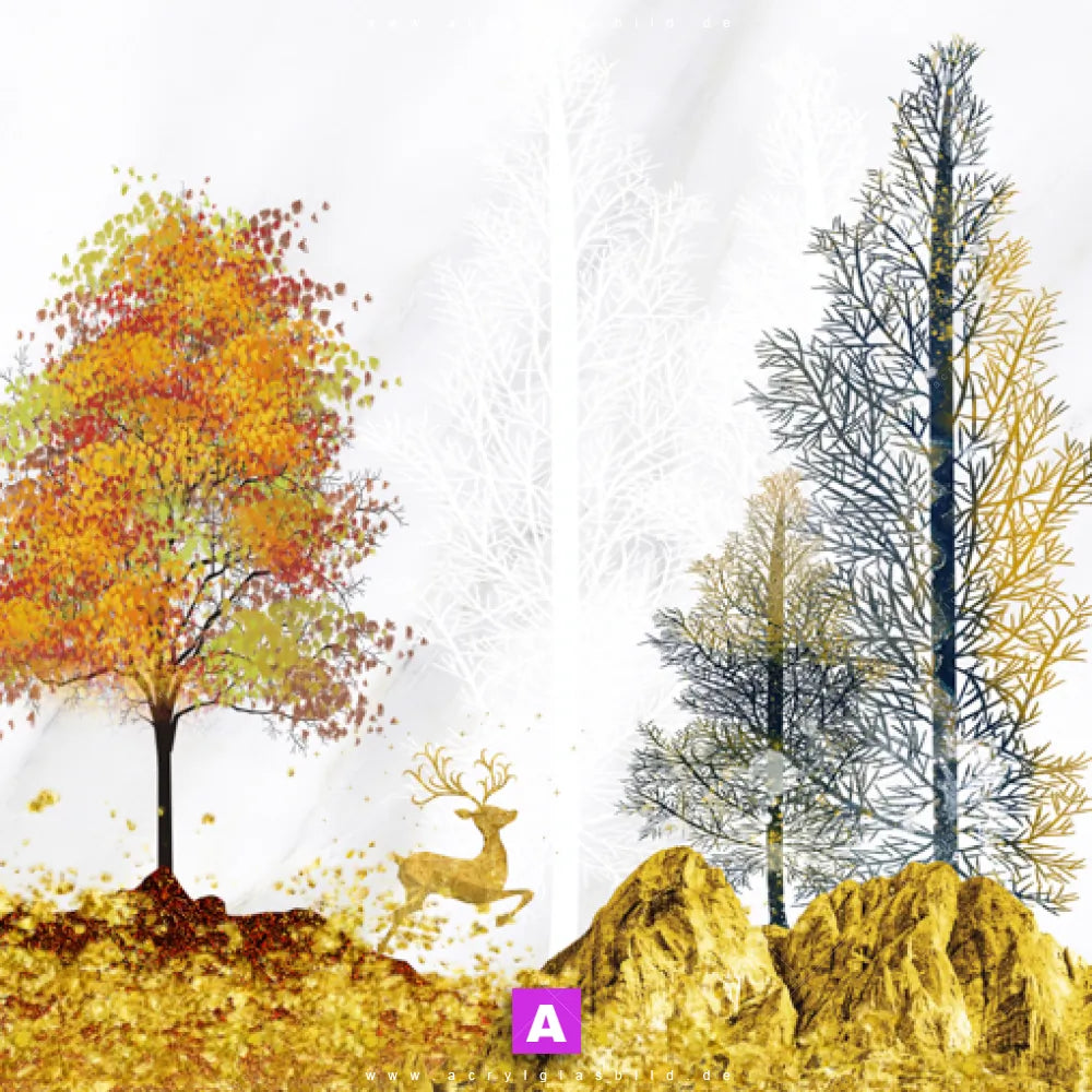 Die einzigartigen Farben in Weiss, Schwarz, Beige, Gold, Ocker, Orange machen das Acrylglasbild Wald in gold mit Abstrakt, Modern, Kunst, Landschaft, Bäume, Tiere, Wald, Hirsch, Rotwild, Berge zu einem echten Hingucker. Egal ob deine Einrichtung minimalistisch, modern oder doch eher wild und ausgefallen ist - unser Acrylglasbild goldener Farblauf vom Wald im Abstrakt, Modern Art Stil passt immer, auch in Wohnzimmer - Schlafzimmer, Bar - Gastronomie, Arzt - Praxis, Büro - Kanzlei.