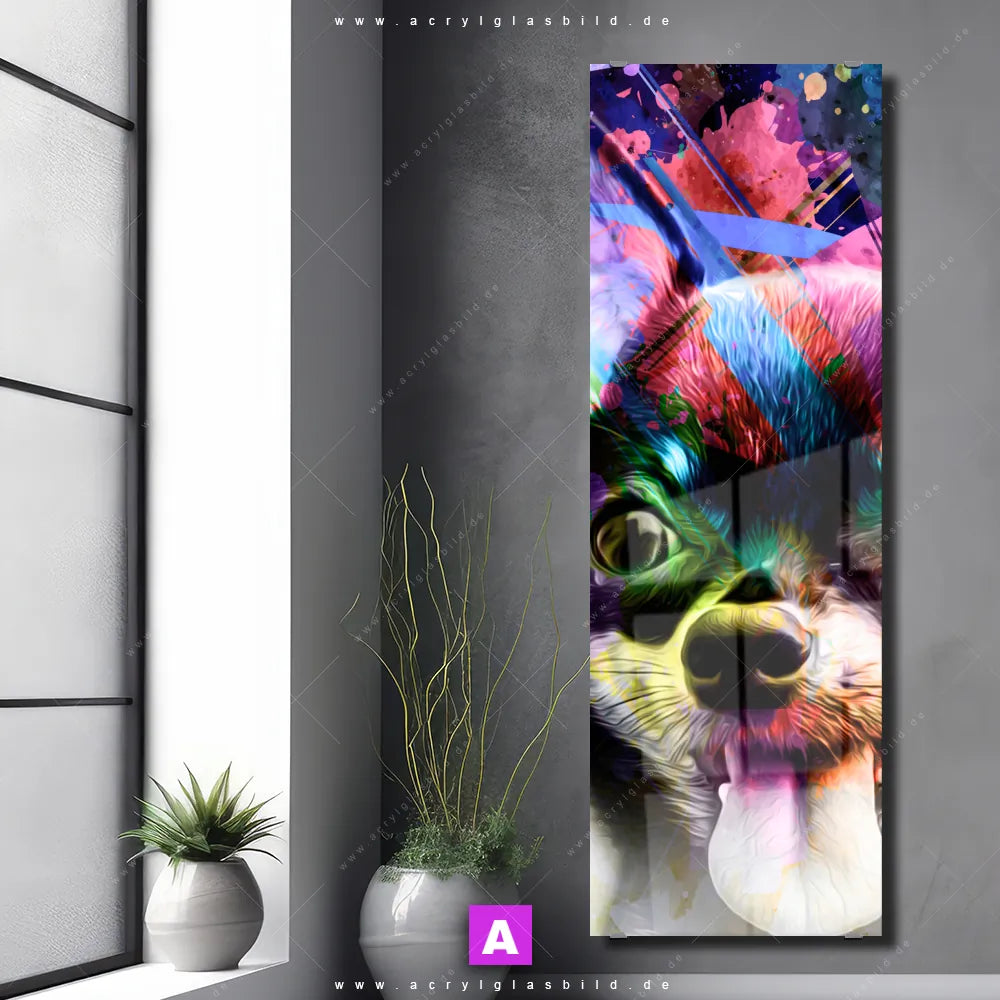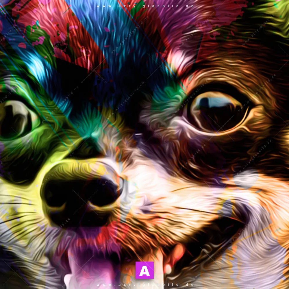 <b>Produktart:</b> Acrylglasbild | Glasbild | Wandbild aus Kunstglas | <b> Motiv:</b> Abstrakter Chihuahua | <b> Bildausrichtung:</b> Schmal | <b> Max. Motiv-Größe:</b> 300cm breit | 210cm hoch | <b> Verfügbare Formate: </b> Quadrat, Querformat, Hochformat, Panorama, Schmal, Rund | <b> Kategorie:</b>  Tierwelt | <b> Farben:</b>  Bunt | <b> Kunstformen:</b>  Kunst - Malerei | <b> Kunststile:</b>  Abstrakt, Grunge, Mixed Media, Modern Art, Pop Art, Street Art