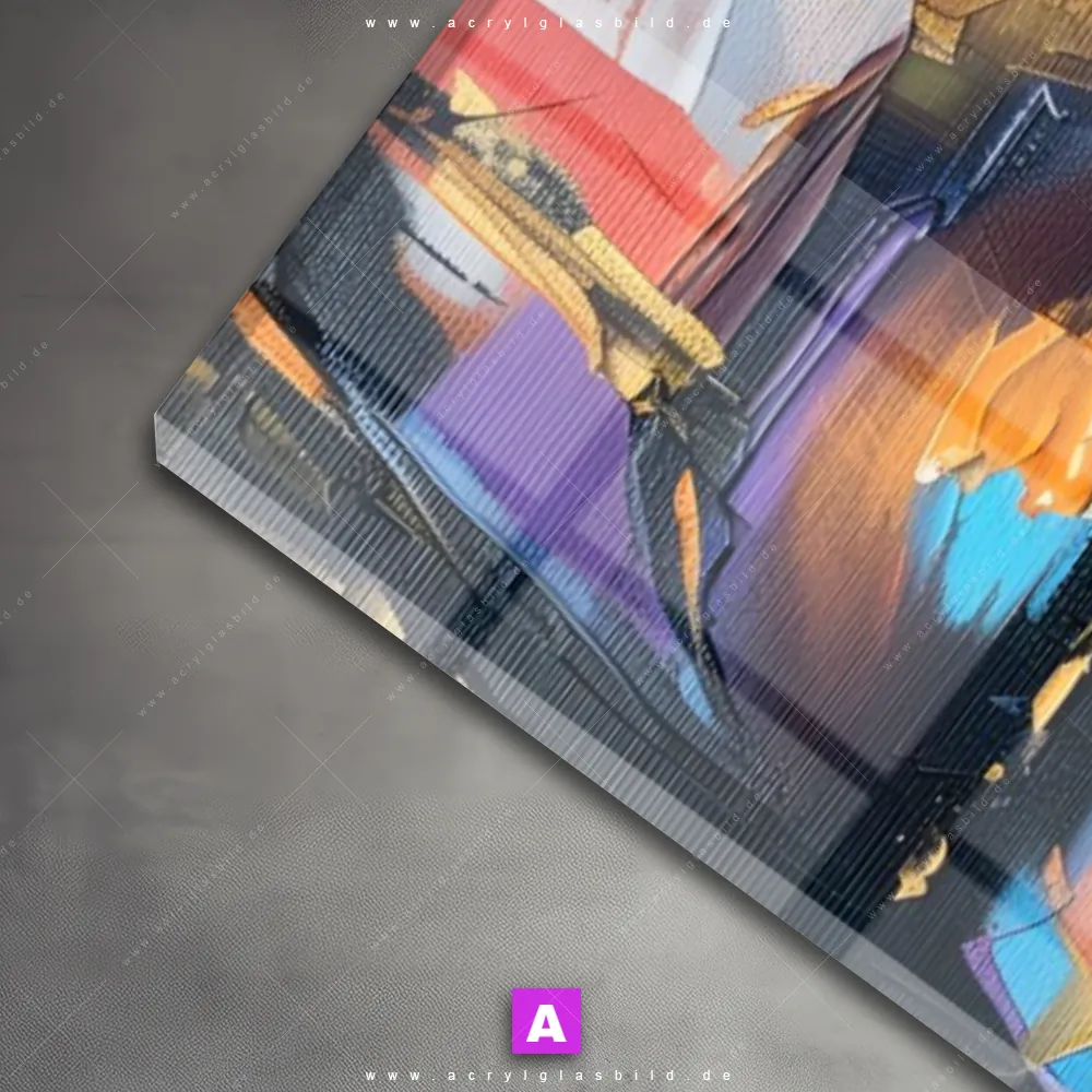 Das Motiv Abstraktes Frauenporträt Dilara wird im UV-Direktdruck in den Farben Orange, Schwarz, Blau, Weiss, Lila auf die Rückseite einer 5mm starken, transparenten Acrylglasplatte gedruckt. Das durchscheinende Motiv Abstraktes Gesicht einer Frau im Abstrakt, Modern Art Stil wird anschließend vollflächig mit einer weißen Schicht hinterlegt. Das Porträts - Menschen Acrylglasbild | Schmal erhält so eine bemerkenswerte Farbbrillanz, hohe Schärfe und erstaunliche Tiefenwirkung.