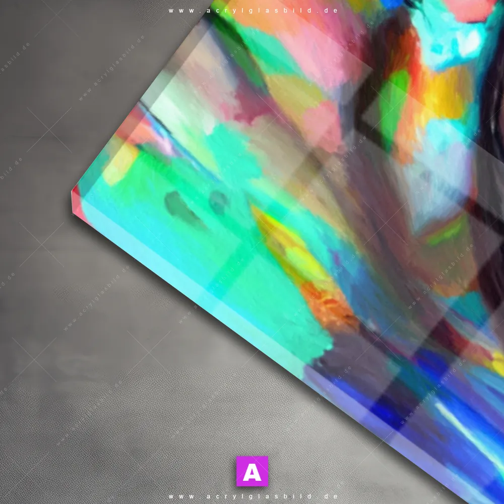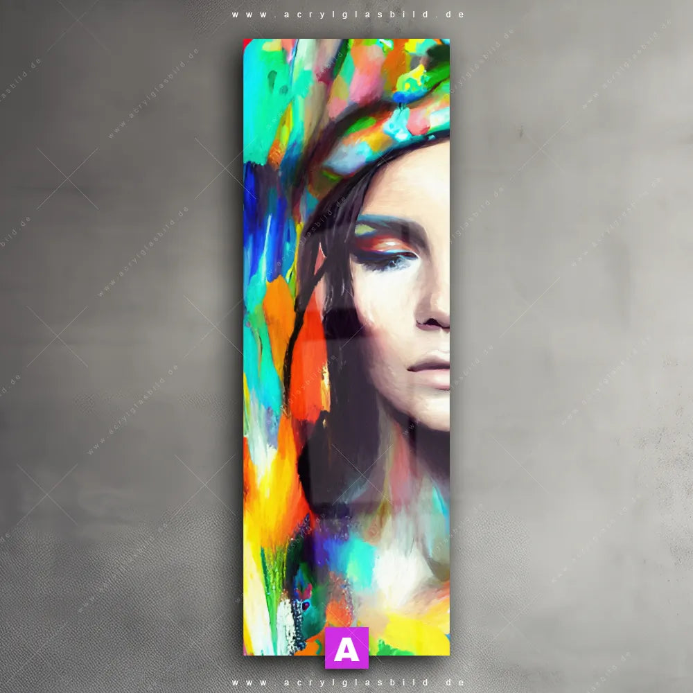 Vergiss also langweilige weiße Wände und entscheide dich für das Acrylglasbild Gesichtsporträt umgeben von bunten Farben, gestaltet als Kunst - Malerei, Digitale Kunst, das deinem Raum Charakter verleiht und dich jeden Tag aufs Neue inspiriert. Mit diesem Porträts - Menschen Acrylglasbild wird deine Wand zur Kunst und du zum Kunstliebhaber.