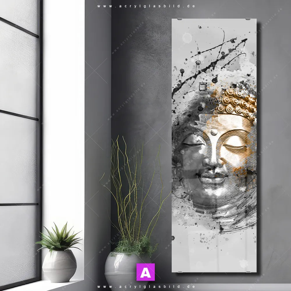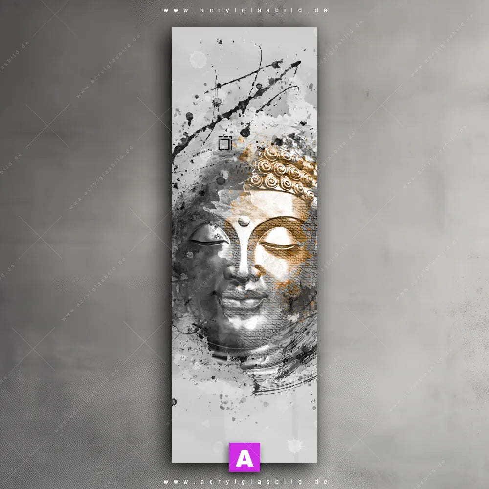 <b>Produktart:</b> Acrylglasbild | Glasbild | Wandbild aus Kunstglas | <b> Motiv:</b> Buddha - Grunge-Stil | <b> Bildausrichtung:</b> Schmal | <b> Max. Motiv-Größe:</b> 240cm breit | 240cm hoch | <b> Verfügbare Formate: </b> Quadrat, Querformat, Hochformat, Panorama, Schmal, Rund | <b> Kategorie:</b> Buddha - Feng Shui | <b> Farben:</b> Silber, Gold | <b> Kunstformen:</b> Digitale Kunst | <b> Kunststile:</b> Abstrakt, Grunge, Mixed Media, Modern Art