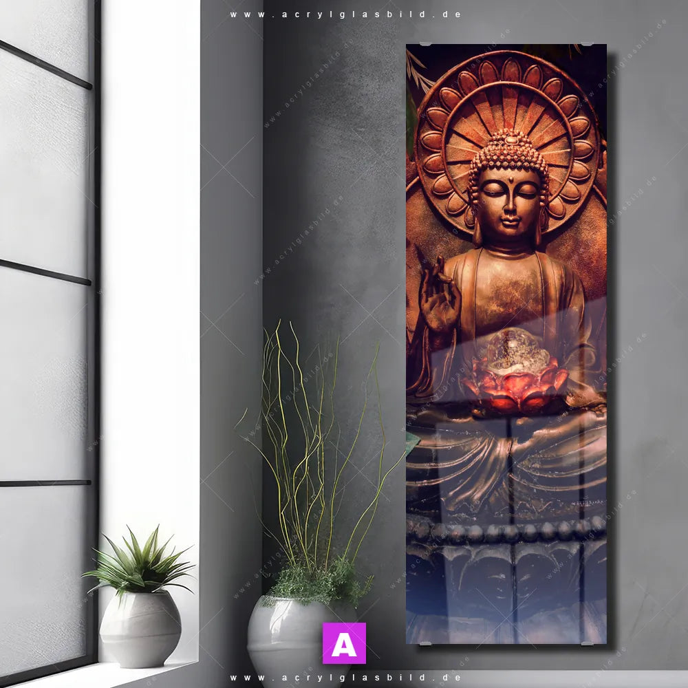 <b>Produktart:</b> Acrylglasbild | Glasbild | Wandbild aus Kunstglas | <b> Motiv:</b> Buddha & Lotusblüte | <b> Bildausrichtung:</b> Schmal | <b> Max. Motiv-Größe:</b> 200cm breit | 300cm hoch | <b> Verfügbare Formate: </b> Quadrat, Querformat, Hochformat, Panorama, Schmal, Rund | <b> Kategorie:</b> Buddha - Feng Shui | <b> Farben:</b> Braun, Blau | <b> Kunstformen:</b> Digitale Kunst, Fotografie | <b> Kunststile:</b> Modern Art, Natürlich - Realistisch