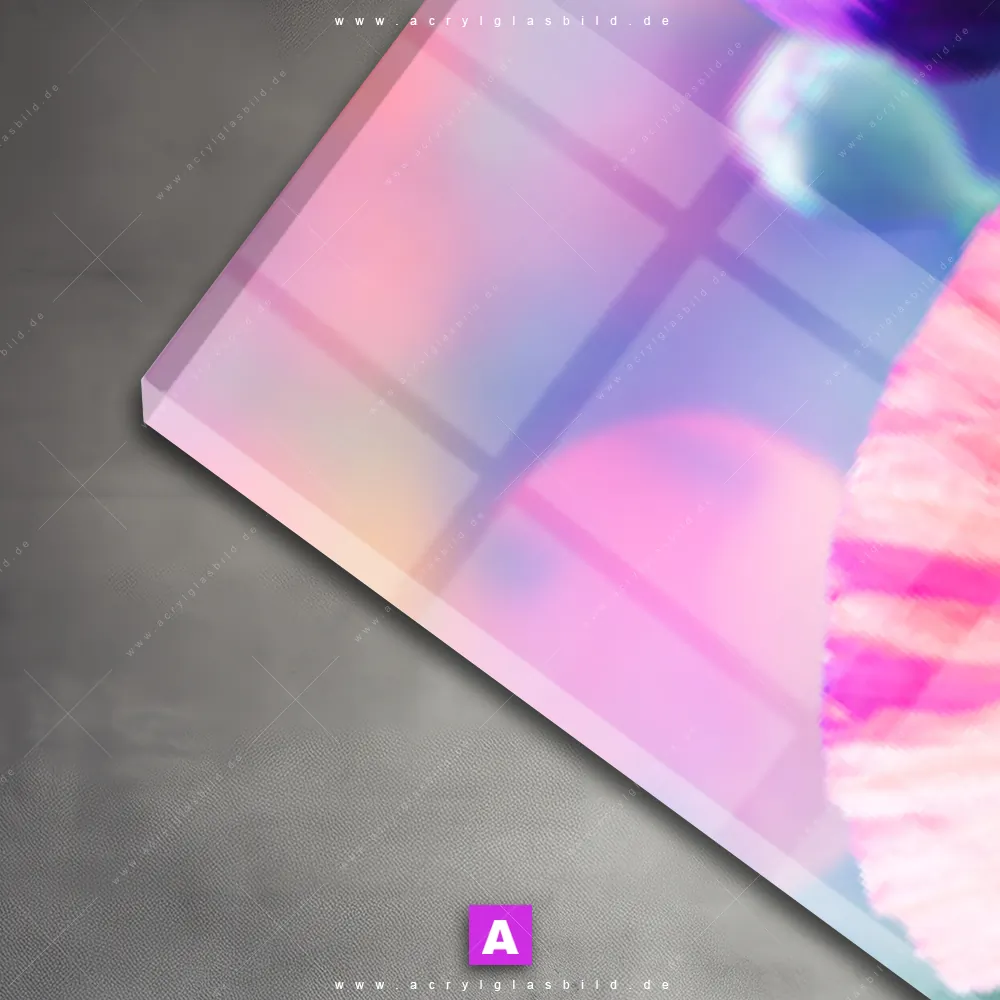 Das Motiv Bunte Mohnblumen wird im UV-Direktdruck in den Farben Grün, Rot, Pink, Lila auf die Rückseite einer 5mm starken, transparenten Acrylglasplatte gedruckt. Das durchscheinende Motiv Feldblumen in rot, gelb, grün im Floral, Natürlich - Realistisch Stil wird anschließend vollflächig mit einer weißen Schicht hinterlegt. Das Landschaften, Blumen - Botanik Acrylglasbild | Schmal erhält so eine bemerkenswerte Farbbrillanz, hohe Schärfe und erstaunliche Tiefenwirkung.