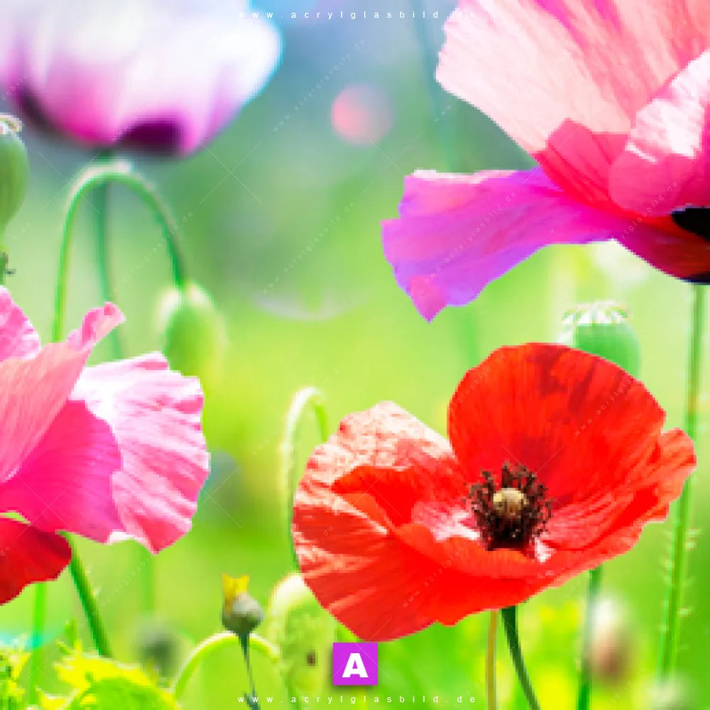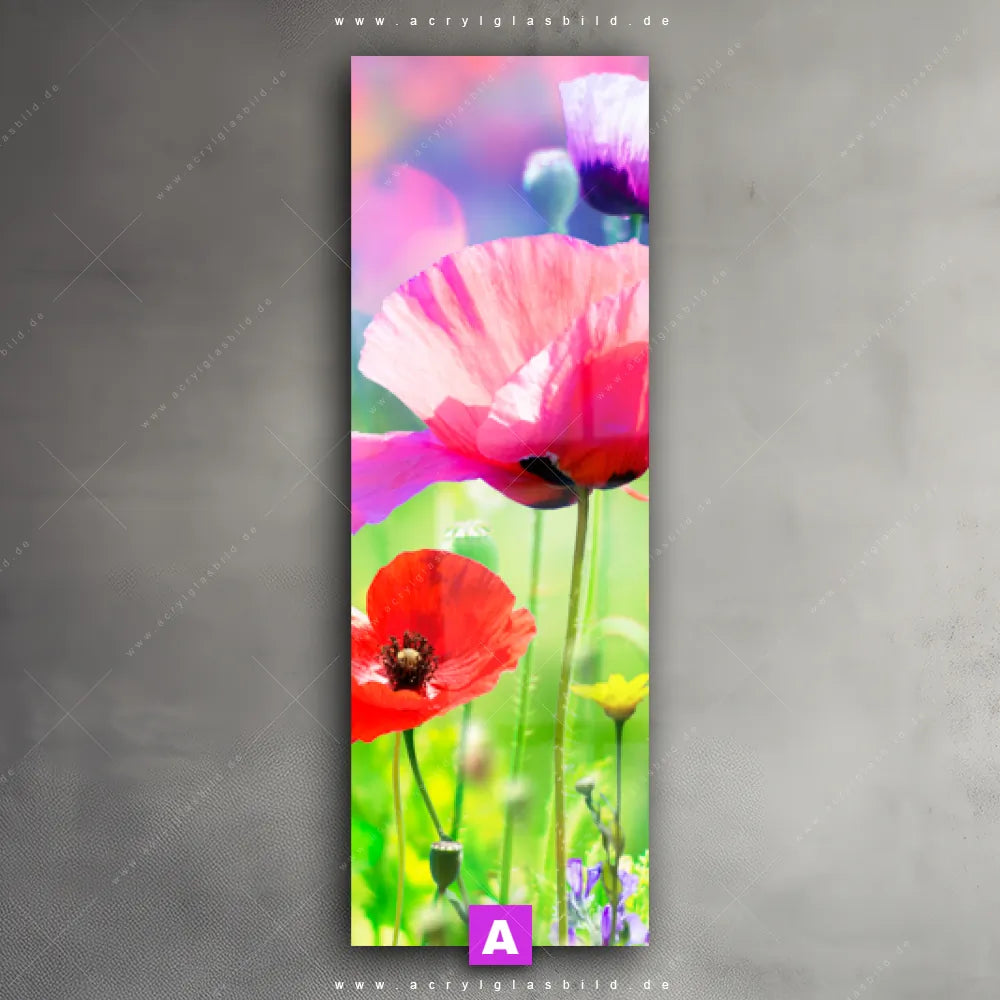 <b>Produktart:</b> Acrylglasbild | Glasbild | Wandbild aus Kunstglas | <b> Motiv:</b> Bunte Mohnblumen | <b> Bildausrichtung:</b> Schmal | <b> Max. Motiv-Größe:</b> 697cm breit | 180cm hoch | <b> Verfügbare Formate: </b> Quadrat, Querformat, Hochformat, Panorama, Schmal, Rund | <b> Kategorie:</b> Landschaften, Blumen - Botanik | <b> Farben:</b> Grün, Rot, Pink, Lila | <b> Kunstformen:</b> Fotografie, Digitale Kunst | <b> Kunststile:</b> Floral, Natürlich - Realistisch