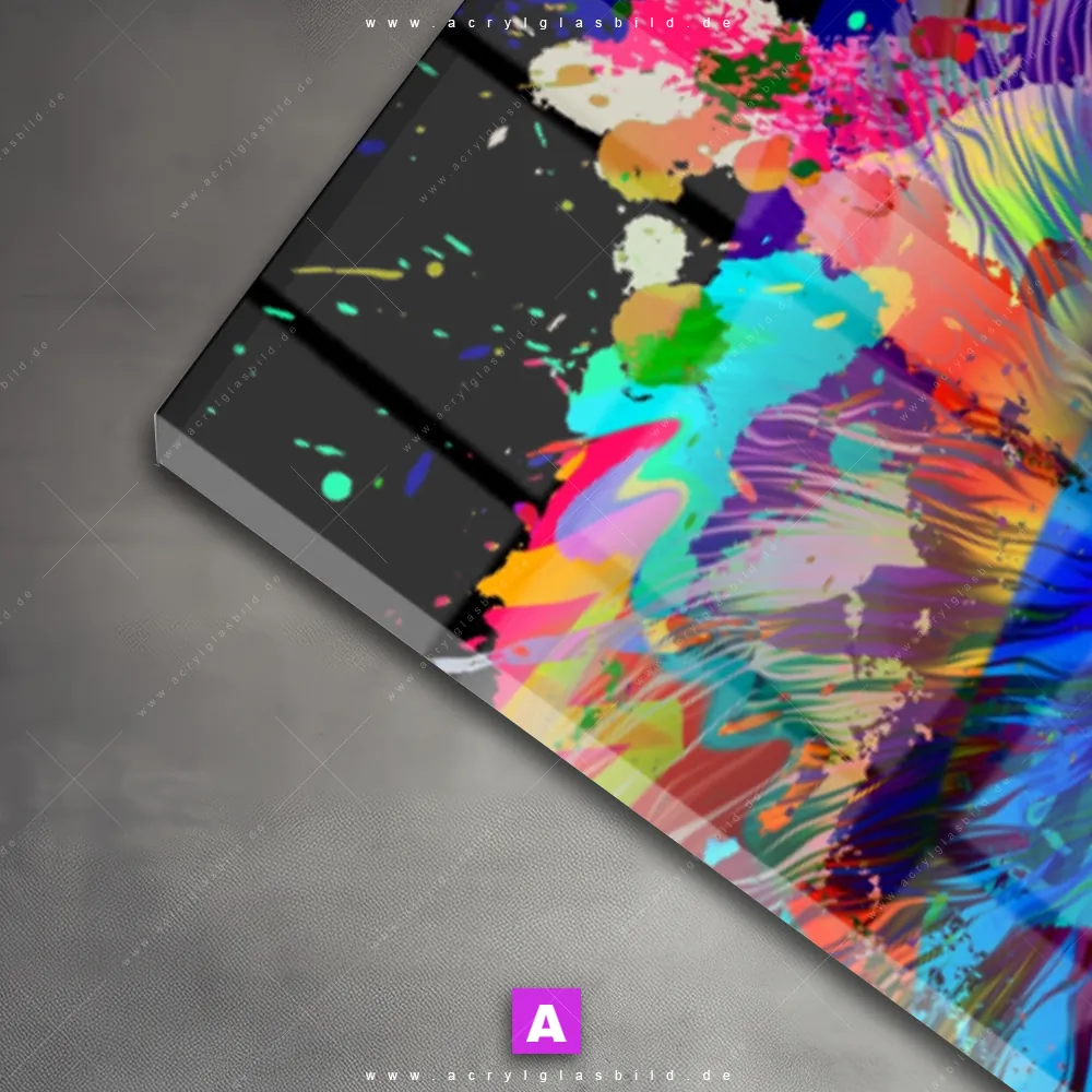 Die einzigartigen Farben in Bunt machen das Acrylglasbild Löwenkopf abstrakt mit Raubkatze, Löwe, Afrika, Dschungel, Lion, Splash, Farbspritzer, Farbexplosion, Porträt, Farbe zu einem echten Hingucker. Egal ob deine Einrichtung minimalistisch, modern oder doch eher wild und ausgefallen ist - unser Acrylglasbild Löwenkopf mit Farbakzenten im Abstrakt, Modern Art, Pop Art, Street Art Stil passt immer, auch in Bar - Gastronomie, Wohnzimmer - Schlafzimmer, Flur - Eingangsbereich.