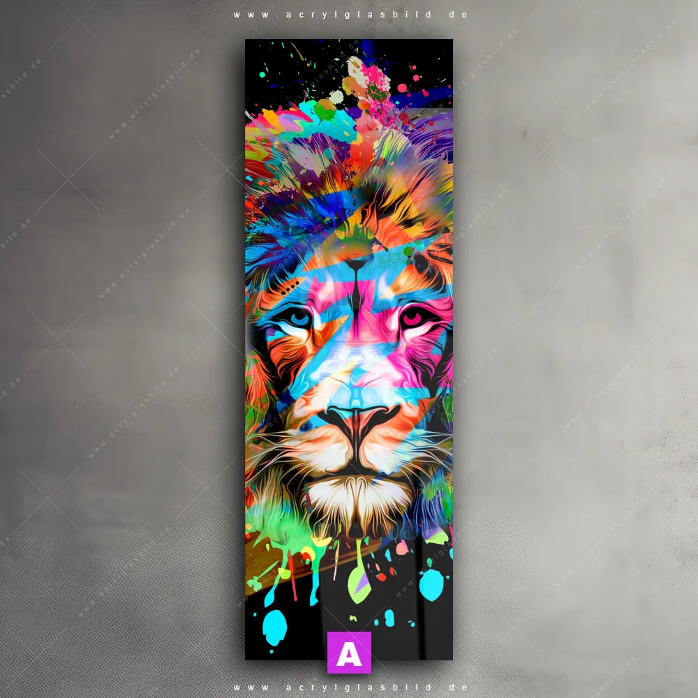 <b>Produktart:</b> Acrylglasbild | Glasbild | Wandbild aus Kunstglas | <b> Motiv:</b> Bunter Löwe Schwarz | <b> Bildausrichtung:</b> Schmal | <b> Max. Motiv-Größe:</b> 270cm breit | 270cm hoch | <b> Verfügbare Formate: </b> Quadrat, Querformat, Hochformat, Panorama, Schmal, Rund | <b> Kategorie:</b> Tierwelt | <b> Farben:</b> Bunt | <b> Kunstformen:</b> Digitale Kunst | <b> Kunststile:</b> Abstrakt, Modern Art, Pop Art, Street Art