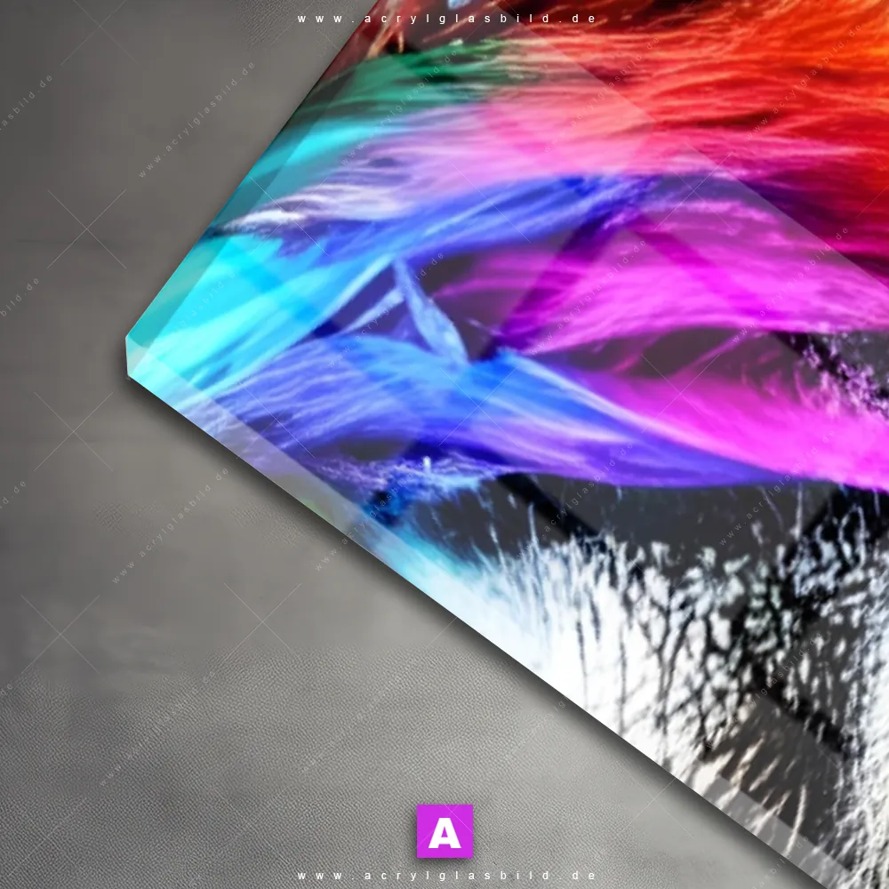 Das Motiv Bunter Orang-Utan wird im UV-Direktdruck in den Farben Bunt auf die Rückseite einer 5mm starken, transparenten Acrylglasplatte gedruckt. Das durchscheinende Motiv Menschenaffe in bunten Farben im Abstrakt, Modern Art, Pop Art Stil wird anschließend vollflächig mit einer weißen Schicht hinterlegt. Das Tierwelt Acrylglasbild | Schmal erhält so eine bemerkenswerte Farbbrillanz, hohe Schärfe und erstaunliche Tiefenwirkung.