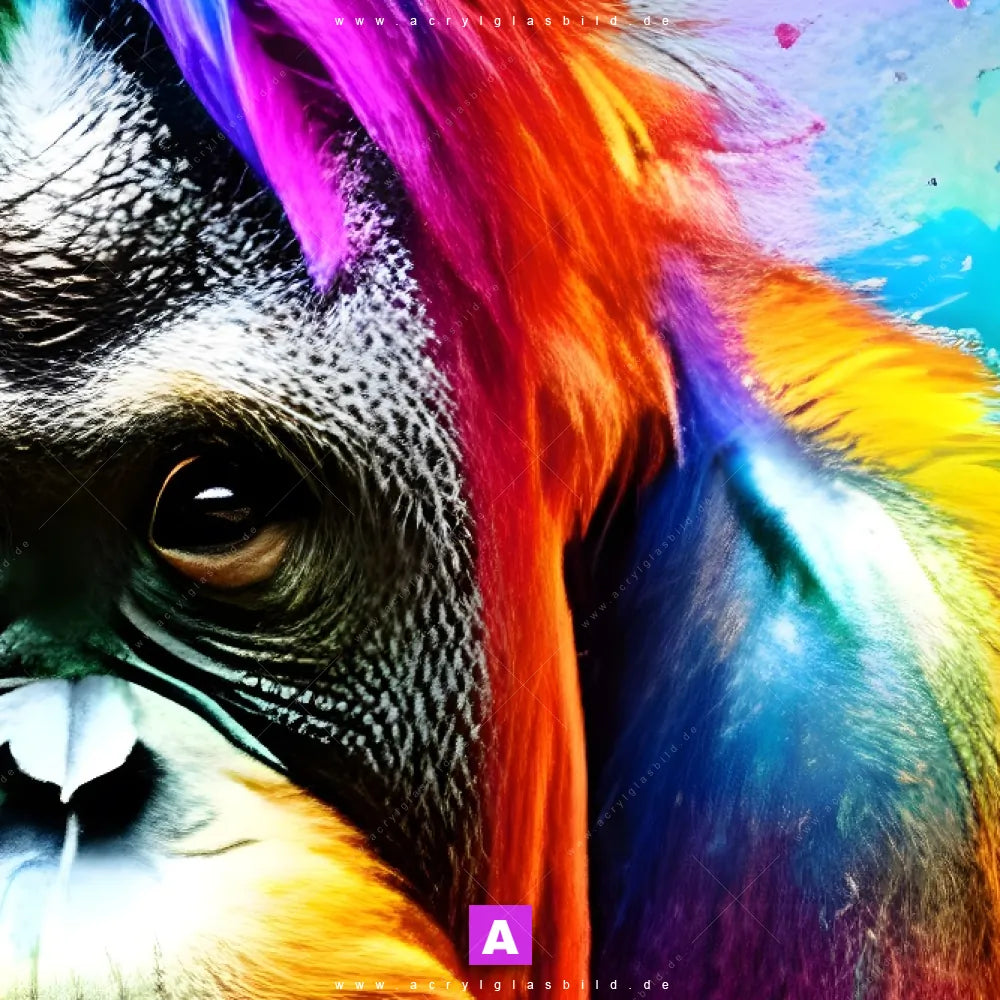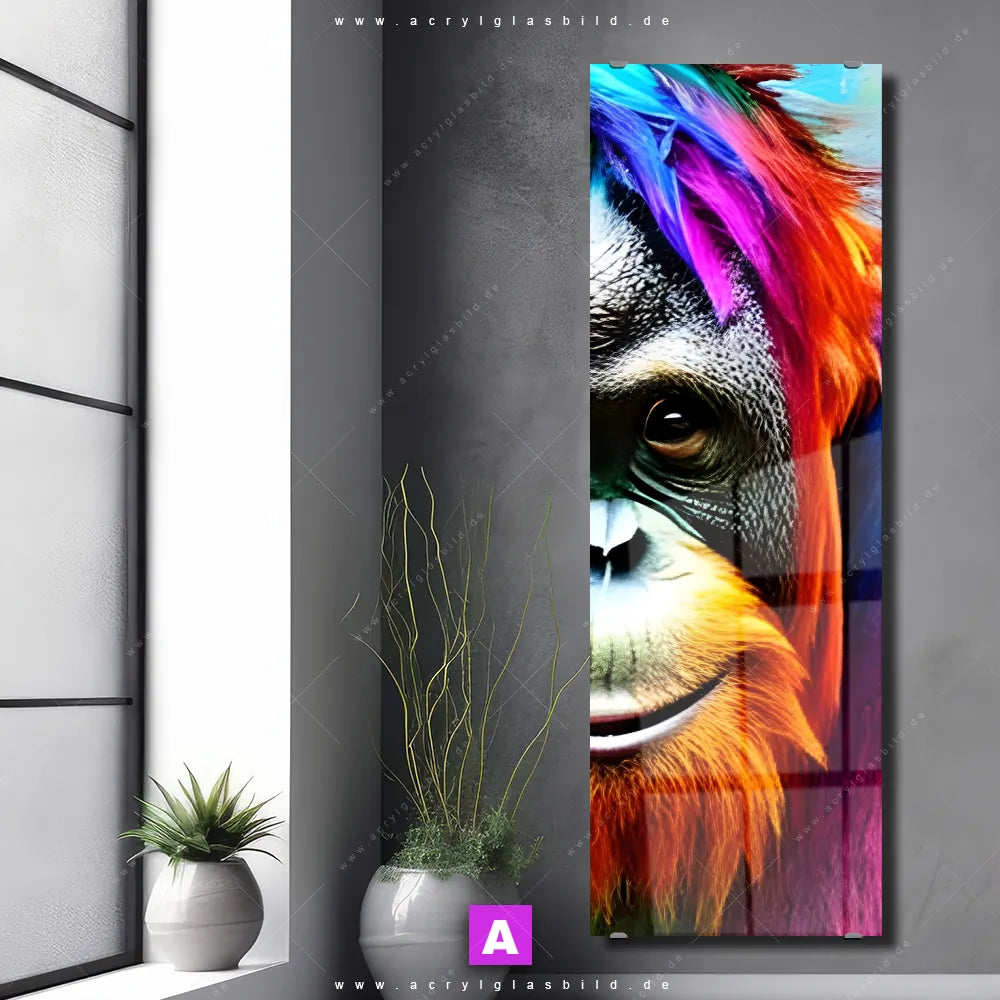 <b>Produktart:</b> Acrylglasbild | Glasbild | Wandbild aus Kunstglas | <b> Motiv:</b> Bunter Orang-Utan | <b> Bildausrichtung:</b> Schmal | <b> Max. Motiv-Größe:</b> 270cm breit | 180cm hoch | <b> Verfügbare Formate: </b> Quadrat, Querformat, Hochformat, Panorama, Schmal, Rund | <b> Kategorie:</b> Tierwelt | <b> Farben:</b> Bunt | <b> Kunstformen:</b> Digitale Kunst | <b> Kunststile:</b> Abstrakt, Modern Art, Pop Art