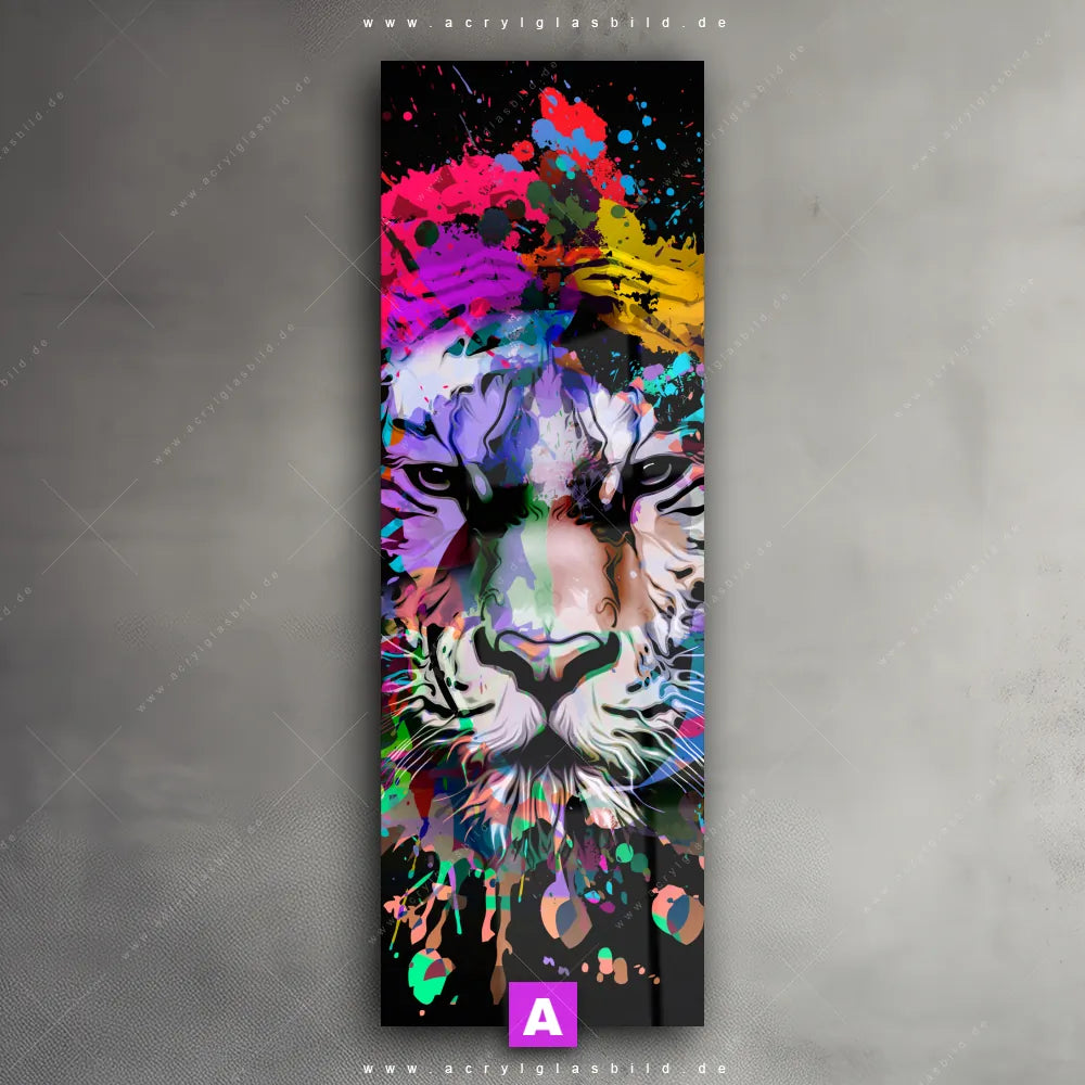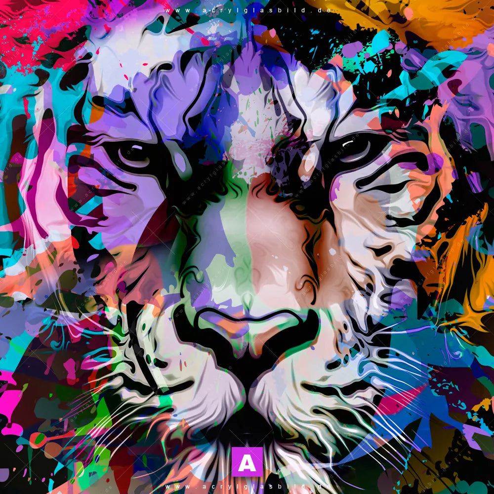 <b>Produktart:</b> Acrylglasbild | Glasbild | Wandbild aus Kunstglas | <b> Motiv:</b> Bunter Tiger Schwarz | <b> Bildausrichtung:</b> Schmal | <b> Max. Motiv-Größe:</b> 270cm breit | 270cm hoch | <b> Verfügbare Formate: </b> Quadrat, Querformat, Hochformat, Panorama, Schmal, Rund | <b> Kategorie:</b> Tierwelt | <b> Farben:</b> Bunt, Schwarz | <b> Kunstformen:</b> Digitale Kunst | <b> Kunststile:</b> Abstrakt, Modern Art, Pop Art, Street Art