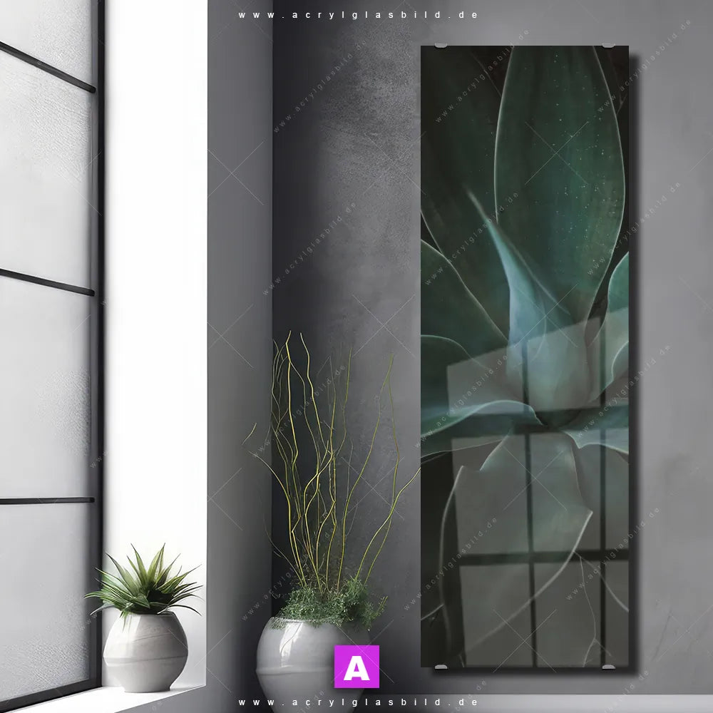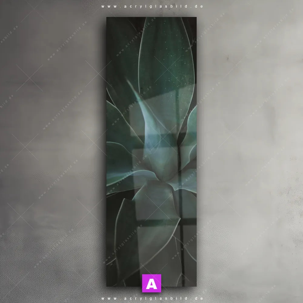 <b>Produktart:</b> Acrylglasbild | Glasbild | Wandbild aus Kunstglas | <b> Motiv:</b> Dunkles Agavenblatt | <b> Bildausrichtung:</b> Schmal | <b> Max. Motiv-Größe:</b> 405cm breit | 270cm hoch | <b> Verfügbare Formate: </b> Quadrat, Querformat, Hochformat, Panorama, Schmal, Rund | <b> Kategorie:</b> Blumen - Botanik | <b> Farben:</b> Grün, Schwarz, Blau, Türkis | <b> Kunstformen:</b> Fotografie | <b> Kunststile:</b> Minimalistisch, Floral