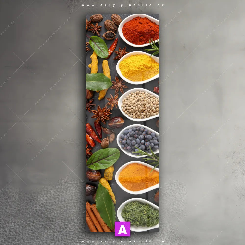 Das Motiv Exotische Geschmackswelten wird im UV-Direktdruck in den Farben Bunt, Weiss, Blau, Braun, Beige, Gelb , Grün, Lila, Ocker, Orange, Rot, Rosa auf die Rückseite einer 5mm starken, transparenten Acrylglasplatte gedruckt. Das durchscheinende Motiv Farbenfrohe Gewürze & Kräuter im Natürlich - Realistisch Stil wird anschließend vollflächig mit einer weißen Schicht hinterlegt. Das Essen - Trinken Acrylglasbild | Schmal erhält so eine bemerkenswerte Farbbrillanz, hohe Schärfe und erstaunliche Tiefenwirkung.