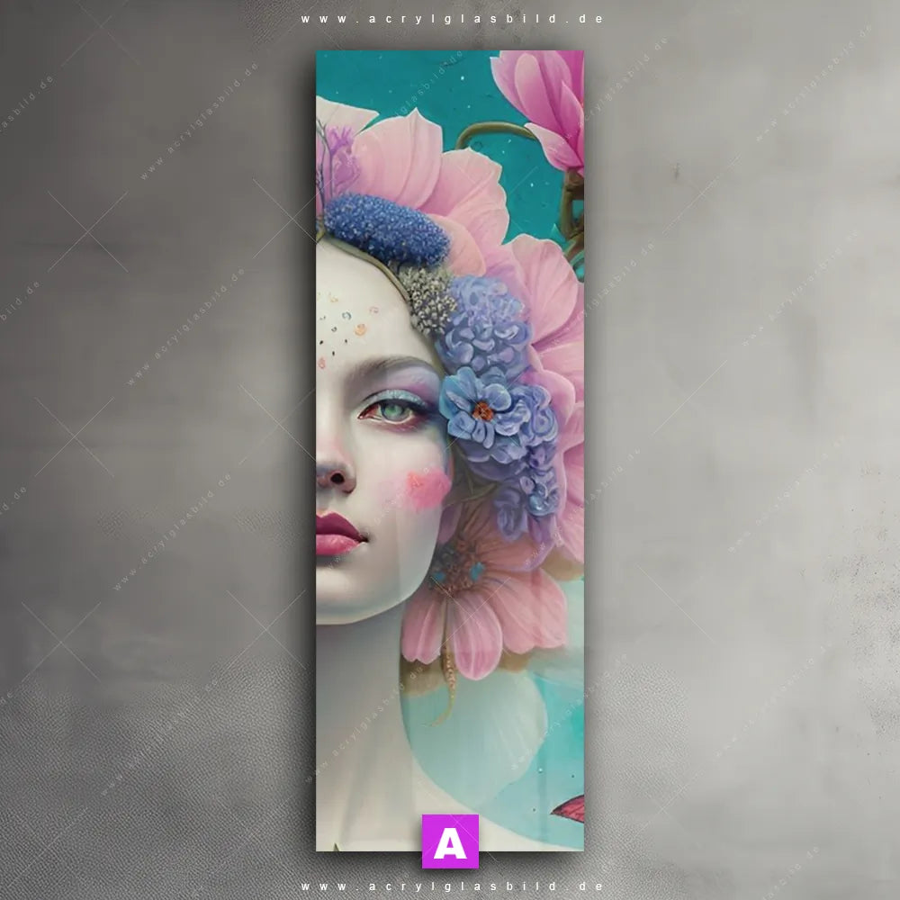 <b>Produktart:</b> Acrylglasbild | Glasbild | Wandbild aus Kunstglas | <b> Motiv:</b> Florales Frauenporträt - Miona | <b> Bildausrichtung:</b> Schmal | <b> Max. Motiv-Größe:</b> 192cm breit | 180cm hoch | <b> Verfügbare Formate: </b> Quadrat, Querformat, Hochformat, Panorama, Schmal, Rund | <b> Kategorie:</b> Porträts - Menschen, Blumen - Botanik | <b> Farben:</b> Blau, Türkis, Rosa, Lila, Weiss | <b> Kunstformen:</b> Fotografie, Digitale Kunst | <b> Kunststile:</b> Modern Art, Floral