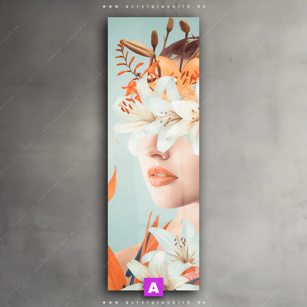 <b>Produktart:</b> Acrylglasbild | Glasbild | Wandbild aus Kunstglas | <b> Motiv:</b> Florales Frauenporträt - Viola | <b> Bildausrichtung:</b> Schmal | <b> Max. Motiv-Größe:</b> 405cm breit | 270cm hoch | <b> Verfügbare Formate: </b> Quadrat, Querformat, Hochformat, Panorama, Schmal, Rund | <b> Kategorie:</b> Porträts - Menschen, Blumen - Botanik | <b> Farben:</b> Orange, Hellblau, Weiss, Hellgrün | <b> Kunstformen:</b> Fotografie, Digitale Kunst | <b> Kunststile:</b> Modern Art, Floral