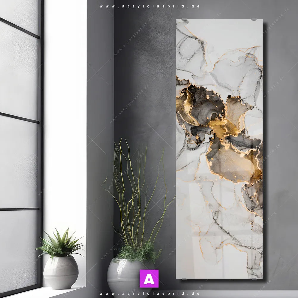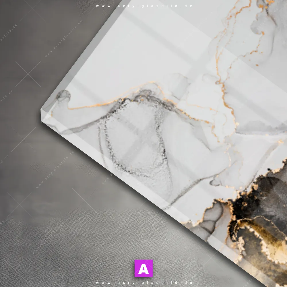 Die einzigartigen Farben in Gold, Weiss, Schwarz machen das Acrylglasbild Marmormuster mit Flüssigkeit, Acryl, flüssig, Farbe, Marmorierung, Tinte, Alkohol, Goldader, Fluid Art zu einem echten Hingucker. Egal ob deine Einrichtung minimalistisch, modern oder doch eher wild und ausgefallen ist - unser Acrylglasbild Marmorierungseffekte im Abstrakt, Modern Art Stil passt immer, auch in Arzt - Praxis, Büro - Kanzlei, Wohnzimmer - Schlafzimmer, Bar - Gastronomie, Friseur - Beauty.