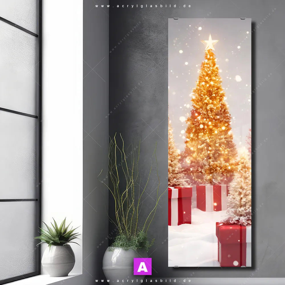 <b>Produktart:</b> Acrylglasbild | Glasbild | Wandbild aus Kunstglas | <b> Motiv:</b> Fröhliche Weihnachten | <b> Bildausrichtung:</b> Schmal | <b> Max. Motiv-Größe:</b> 270cm breit | 180cm hoch | <b> Verfügbare Formate: </b> Quadrat, Querformat, Hochformat, Panorama, Schmal, Rund | <b> Kategorie:</b> Winter | <b> Farben:</b> Weiss, Gold, Beige, Orange, Rot, Grau | <b> Kunstformen:</b> Digitale Kunst, Vektor - Illustration | <b> Kunststile:</b> Abstrakt, Minimalistisch