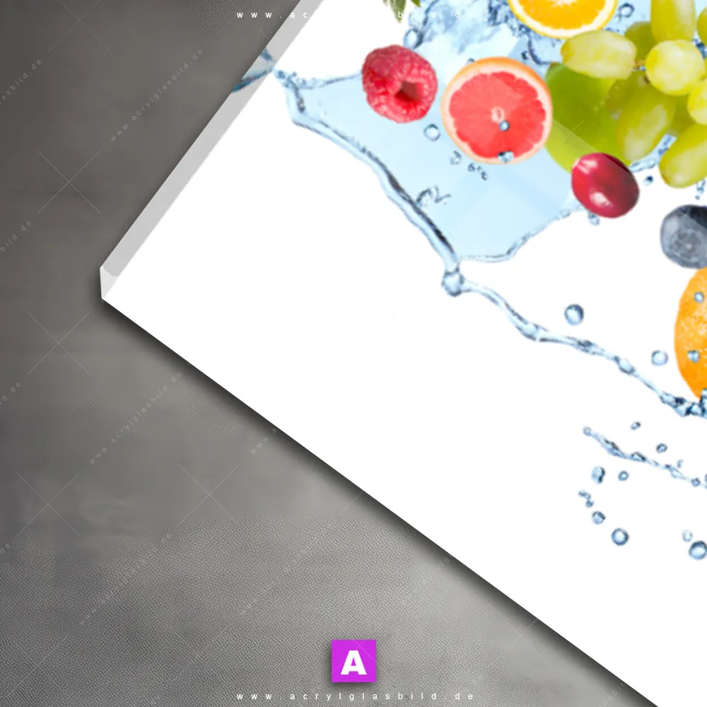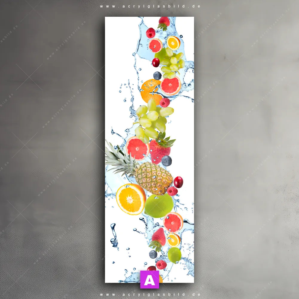<b>Produktart:</b> Acrylglasbild | Glasbild | Wandbild aus Kunstglas | <b> Motiv:</b> Früchte in Spritzwasser | <b> Bildausrichtung:</b> Schmal | <b> Max. Motiv-Größe:</b> 300cm breit | 421cm hoch | <b> Verfügbare Formate: </b> Quadrat, Querformat, Hochformat, Panorama, Schmal, Rund | <b> Kategorie:</b>  Essen - Trinken | <b> Farben:</b>  Bunt, Weiss, Blau, Gelb , Braun, Grün, Lila, Orange, Rot | <b> Kunstformen:</b>  Fotografie, Digitale Kunst | <b> Kunststile:</b>  Mixed Media, Modern Art