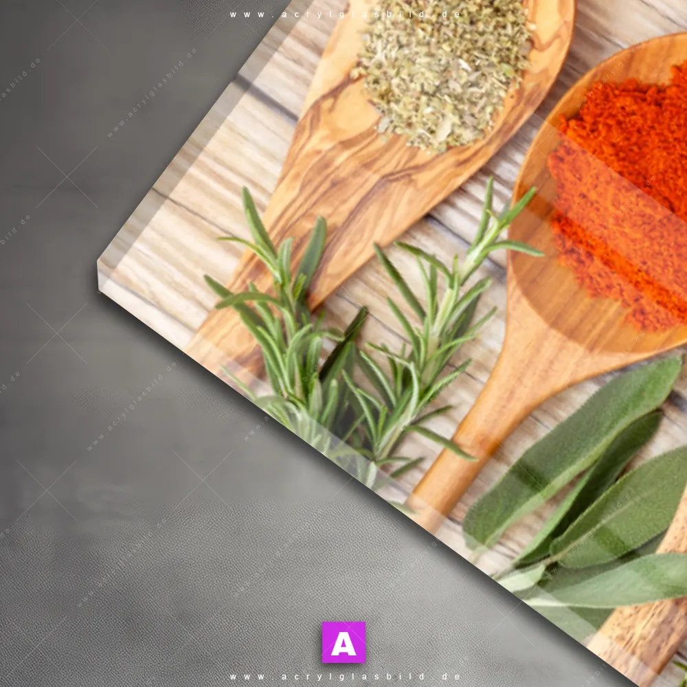 Vergiss also langweilige weiße Wände und entscheide dich für das Acrylglasbild Tisch mit Gewürzen und Kräutern auf Löffeln, gestaltet als Fotografie, das deinem Raum Charakter verleiht und dich jeden Tag aufs Neue inspiriert. Mit diesem Essen - Trinken Acrylglasbild wird deine Wand zur Kunst und du zum Kunstliebhaber.