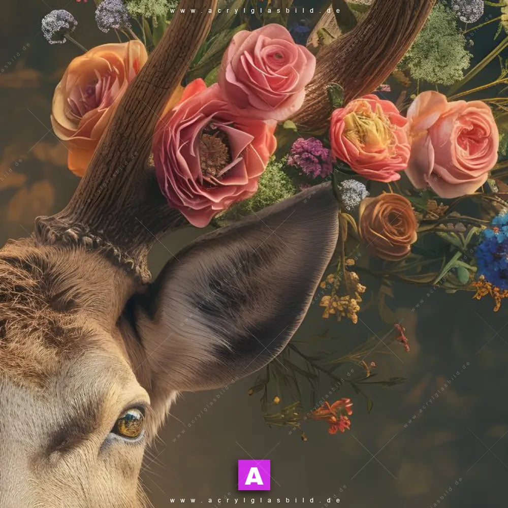 <b>Produktart:</b> Acrylglasbild | Glasbild | Wandbild aus Kunstglas | <b> Motiv:</b> Hirsch mit floralem Geweih | <b> Bildausrichtung:</b> Schmal | <b> Max. Motiv-Größe:</b> 300cm breit | 300cm hoch | <b> Verfügbare Formate: </b> Quadrat, Querformat, Hochformat, Panorama, Schmal, Rund | <b> Kategorie:</b> Tierwelt, Blumen - Botanik | <b> Farben:</b> Beige, Braun, Rosa, Grün | <b> Kunstformen:</b> KI-generiertes Bild | <b> Kunststile:</b> Floral, Retro - Vintage, Surreal - Fantasy