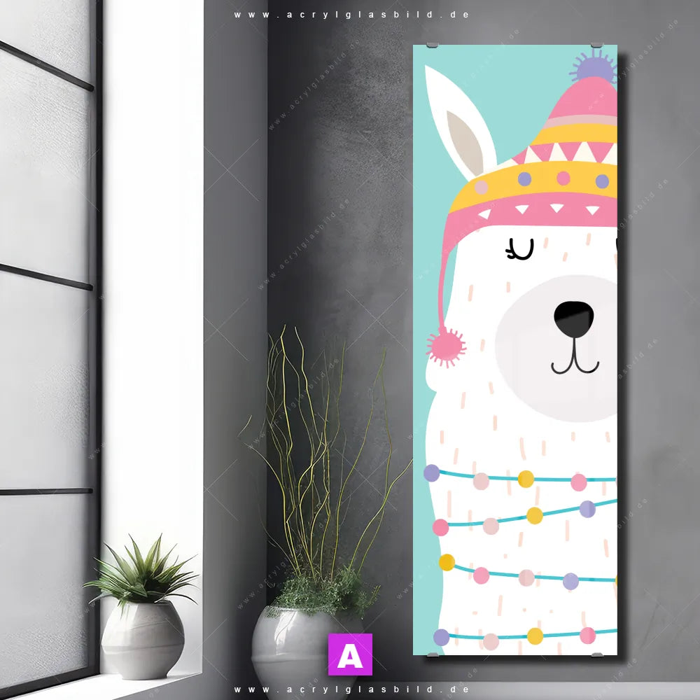 Die einzigartigen Farben in Türkis, Rosa, Weiss, Orange machen das Acrylglasbild No Drama Lama mit Kinder, Tiere, Kunst, Freunde, Nachtlicht, träumen, Lama, Alpaka zu einem echten Hingucker. Egal ob deine Einrichtung minimalistisch, modern oder doch eher wild und ausgefallen ist - unser Acrylglasbild Lama mit Mütze im Modern Art Stil passt immer, auch in Kinderzimmer, Friseur - Beauty, Arzt - Praxis.