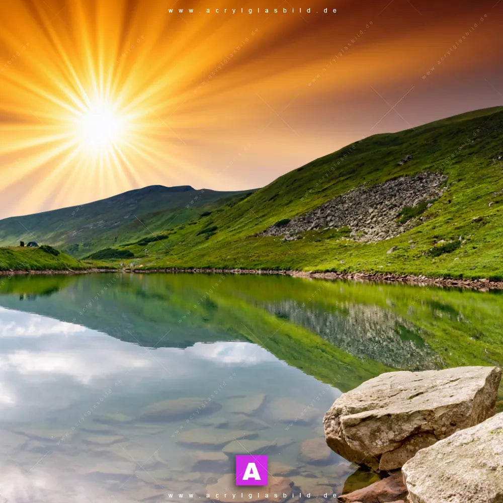 Die einzigartigen Farben in Orange, Grün machen das Acrylglasbild Sonnenstrahlen über Bergsee mit Landschaft, Natur, Stille, See, Wasser, Berge, Sonnenuntergang, Sonnenaufgang, Sonne, Gebirge zu einem echten Hingucker. Egal ob deine Einrichtung minimalistisch, modern oder doch eher wild und ausgefallen ist - unser Acrylglasbild See in den Bergen mit beeindruckendem Sonnenuntergang im Natürlich - Realistisch, Mixed Media Stil passt immer, auch in Arzt - Praxis, Büro - Kanzlei, Wohnzimmer - Schlafzimmer.
