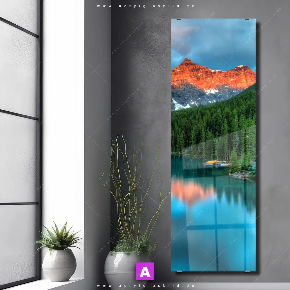 Das Motiv Moränensee Sonnenaufgang wird im UV-Direktdruck in den Farben Weiss, Blau, Grün, Hellblau, Hellgrün, Ocker, Rot, Türkis, Braun auf die Rückseite einer 5mm starken, transparenten Acrylglasplatte gedruckt. Das durchscheinende Motiv Idyllische Morgenstimmung am See im Natürlich - Realistisch Stil wird anschließend vollflächig mit einer weißen Schicht hinterlegt. Das Landschaften Acrylglasbild | Schmal erhält so eine bemerkenswerte Farbbrillanz, hohe Schärfe und erstaunliche Tiefenwirkung.
