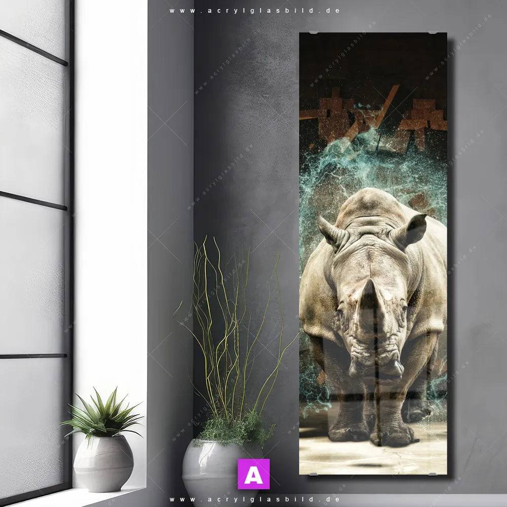 <b>Produktart:</b> Acrylglasbild | Glasbild | Wandbild aus Kunstglas | <b> Motiv:</b> Nashorn zerstört Wand | <b> Bildausrichtung:</b> Schmal | <b> Max. Motiv-Größe:</b> 320cm breit | 240cm hoch | <b> Verfügbare Formate: </b> Quadrat, Querformat, Hochformat, Panorama, Schmal, Rund | <b> Kategorie:</b> Tierwelt | <b> Farben:</b> Beige, Türkis, Schwarz | <b> Kunstformen:</b> Digitale Kunst | <b> Kunststile:</b> Modern Art, Mixed Media
