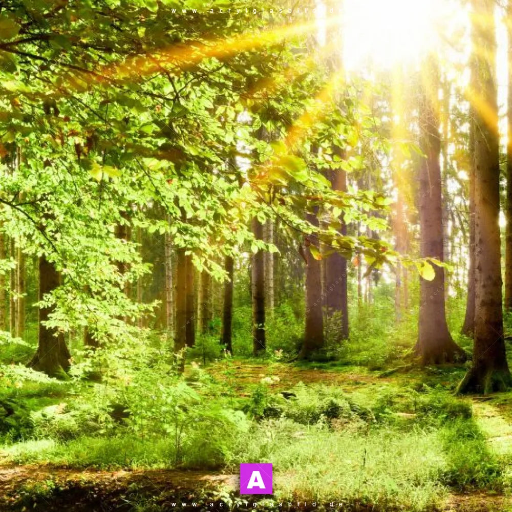Das Motiv Natur pur - Der Wald wird im UV-Direktdruck in den Farben Grün, Braun, Hellgrün, Beige auf die Rückseite einer 5mm starken, transparenten Acrylglasplatte gedruckt. Das durchscheinende Motiv Sonnenschein im Wald im Natürlich - Realistisch Stil wird anschließend vollflächig mit einer weißen Schicht hinterlegt. Das Landschaften, Wald - Bäume Acrylglasbild | Schmal erhält so eine bemerkenswerte Farbbrillanz, hohe Schärfe und erstaunliche Tiefenwirkung.