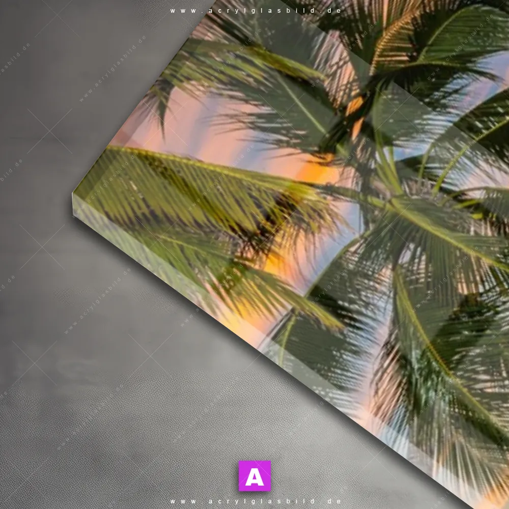Das Motiv Paradiesische Insel wird im UV-Direktdruck in den Farben Orange, Grün, Blau auf die Rückseite einer 5mm starken, transparenten Acrylglasplatte gedruckt. Das durchscheinende Motiv Strandpalmen auf Insel im Retro - Vintage, Natürlich - Realistisch Stil wird anschließend vollflächig mit einer weißen Schicht hinterlegt. Das Landschaften, Strand - Meer Acrylglasbild | Schmal erhält so eine bemerkenswerte Farbbrillanz, hohe Schärfe und erstaunliche Tiefenwirkung.