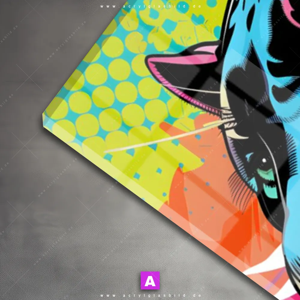 Das Motiv Pop Art Panther wird im UV-Direktdruck in den Farben Schwarz, Bunt auf die Rückseite einer 5mm starken, transparenten Acrylglasplatte gedruckt. Das durchscheinende Motiv Bunte Raubkatzen-Kunst im Pop Art, Modern Art, Abstrakt Stil wird anschließend vollflächig mit einer weißen Schicht hinterlegt. Das Tierwelt Acrylglasbild | Schmal erhält so eine bemerkenswerte Farbbrillanz, hohe Schärfe und erstaunliche Tiefenwirkung.