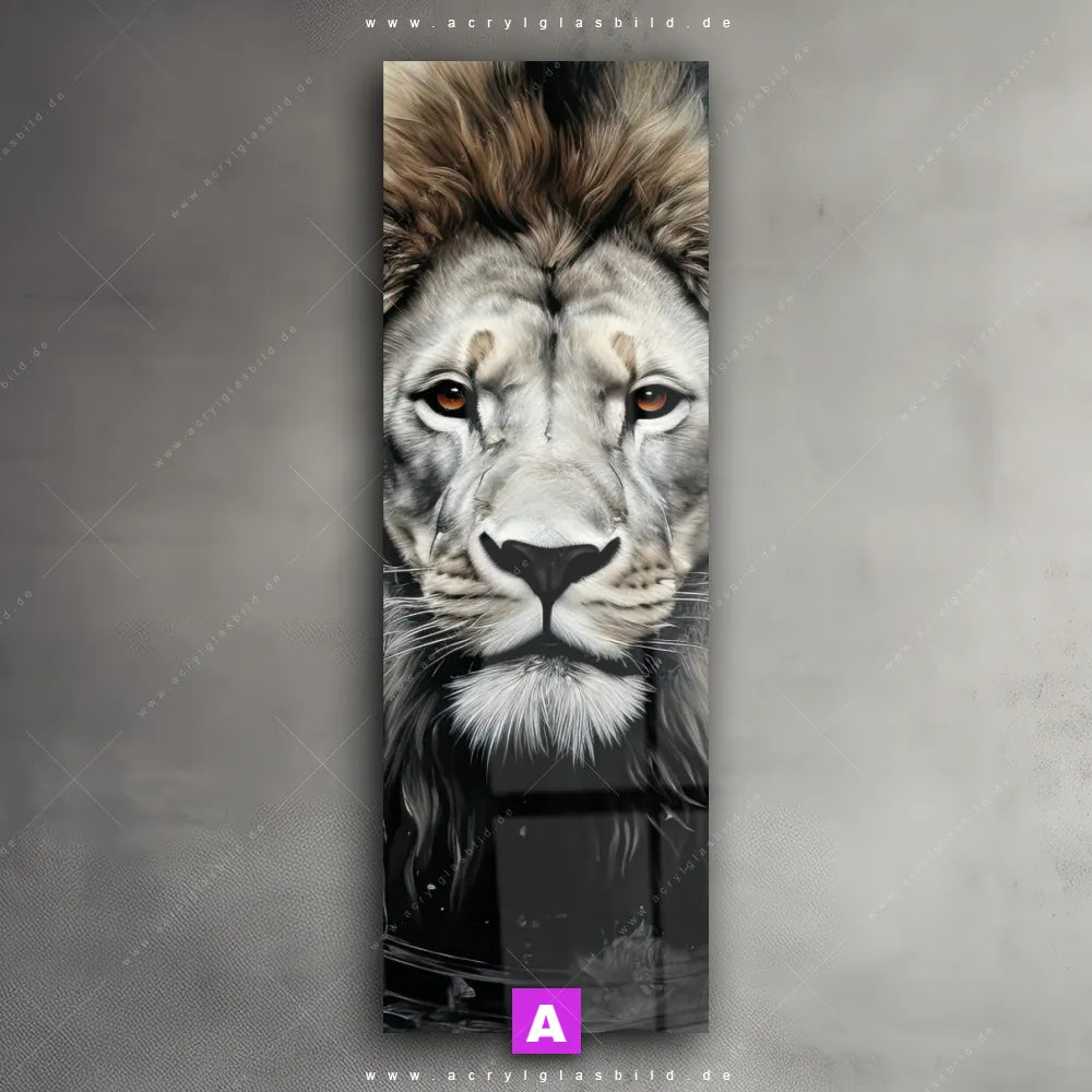 <b>Produktart:</b> Acrylglasbild | Glasbild | Wandbild aus Kunstglas | <b> Motiv:</b> Porträt eines Löwen | <b> Bildausrichtung:</b> Schmal | <b> Max. Motiv-Größe:</b> 430cm breit | 240cm hoch | <b> Verfügbare Formate: </b> Quadrat, Querformat, Hochformat, Panorama, Schmal, Rund | <b> Kategorie:</b> Tierwelt | <b> Farben:</b> Schwarz, Beige | <b> Kunstformen:</b> Kunst - Malerei, Digitale Kunst | <b> Kunststile:</b> Abstrakt, Modern Art, Schwarz - Weiss