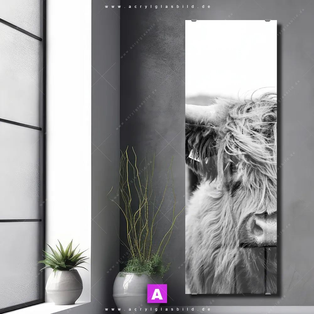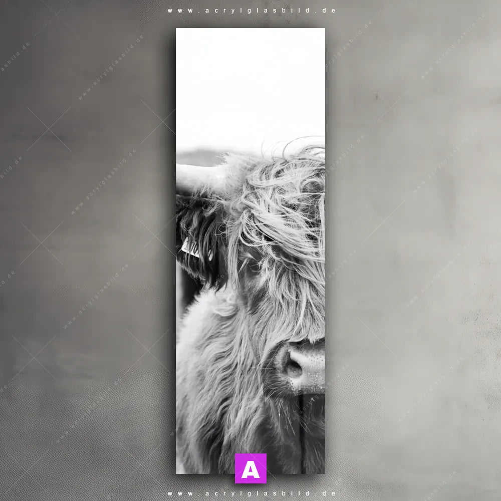 <b>Produktart:</b> Acrylglasbild | Glasbild | Wandbild aus Kunstglas | <b> Motiv:</b> Rind im Hochland | <b> Bildausrichtung:</b> Schmal | <b> Max. Motiv-Größe:</b> 450cm breit | 300cm hoch | <b> Verfügbare Formate: </b> Quadrat, Querformat, Hochformat, Panorama, Schmal, Rund | <b> Kategorie:</b> Tierwelt | <b> Farben:</b> Schwarz, Weiss | <b> Kunstformen:</b> Fotografie | <b> Kunststile:</b> Natürlich - Realistisch, Schwarz - Weiss