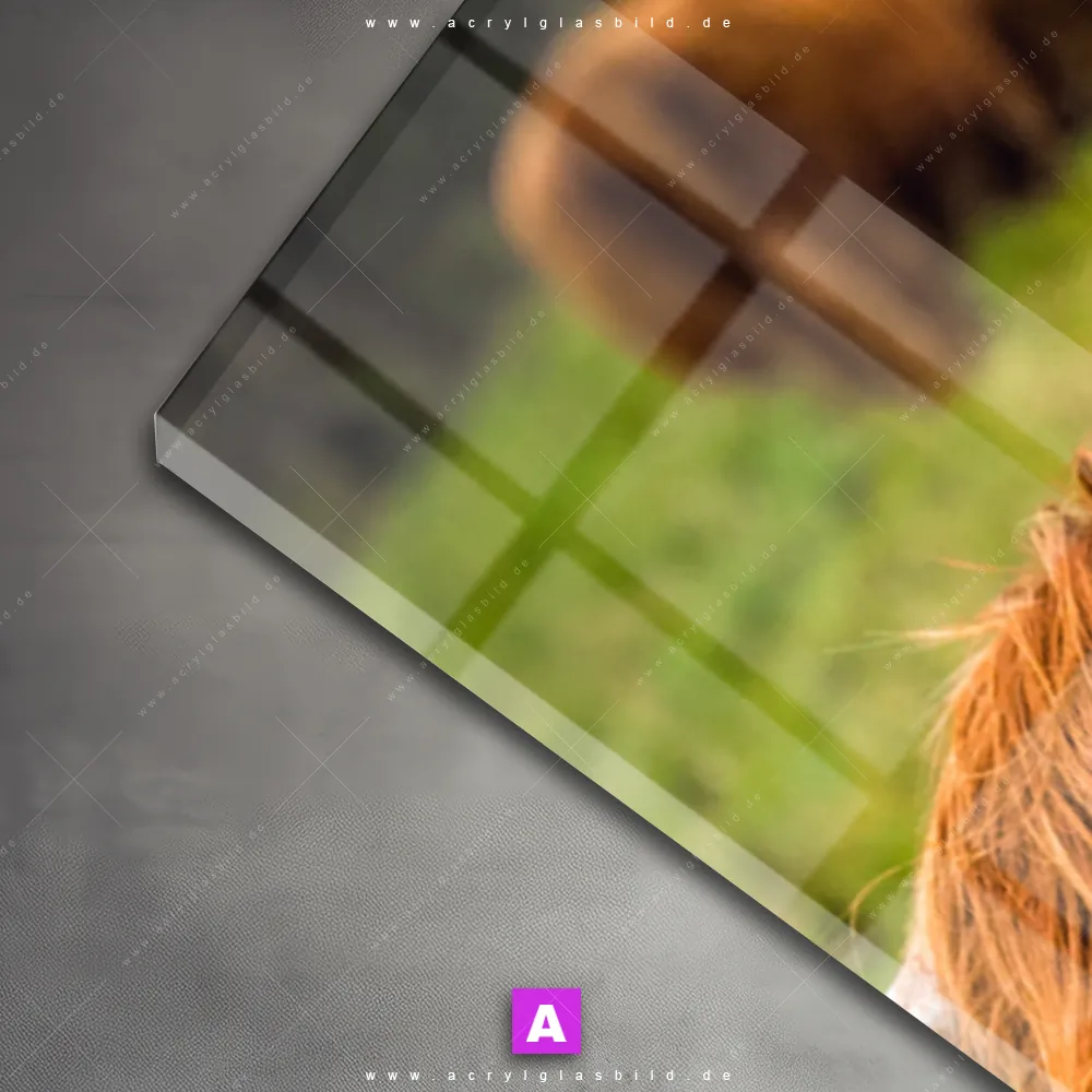 Das Motiv Rind in den schottischen Highlands wird im UV-Direktdruck in den Farben Braun, Grün auf die Rückseite einer 5mm starken, transparenten Acrylglasplatte gedruckt. Das durchscheinende Motiv liegendes Hochlandrind im Modern Art, Natürlich - Realistisch Stil wird anschließend vollflächig mit einer weißen Schicht hinterlegt. Das Tierwelt Acrylglasbild | Schmal erhält so eine bemerkenswerte Farbbrillanz, hohe Schärfe und erstaunliche Tiefenwirkung.