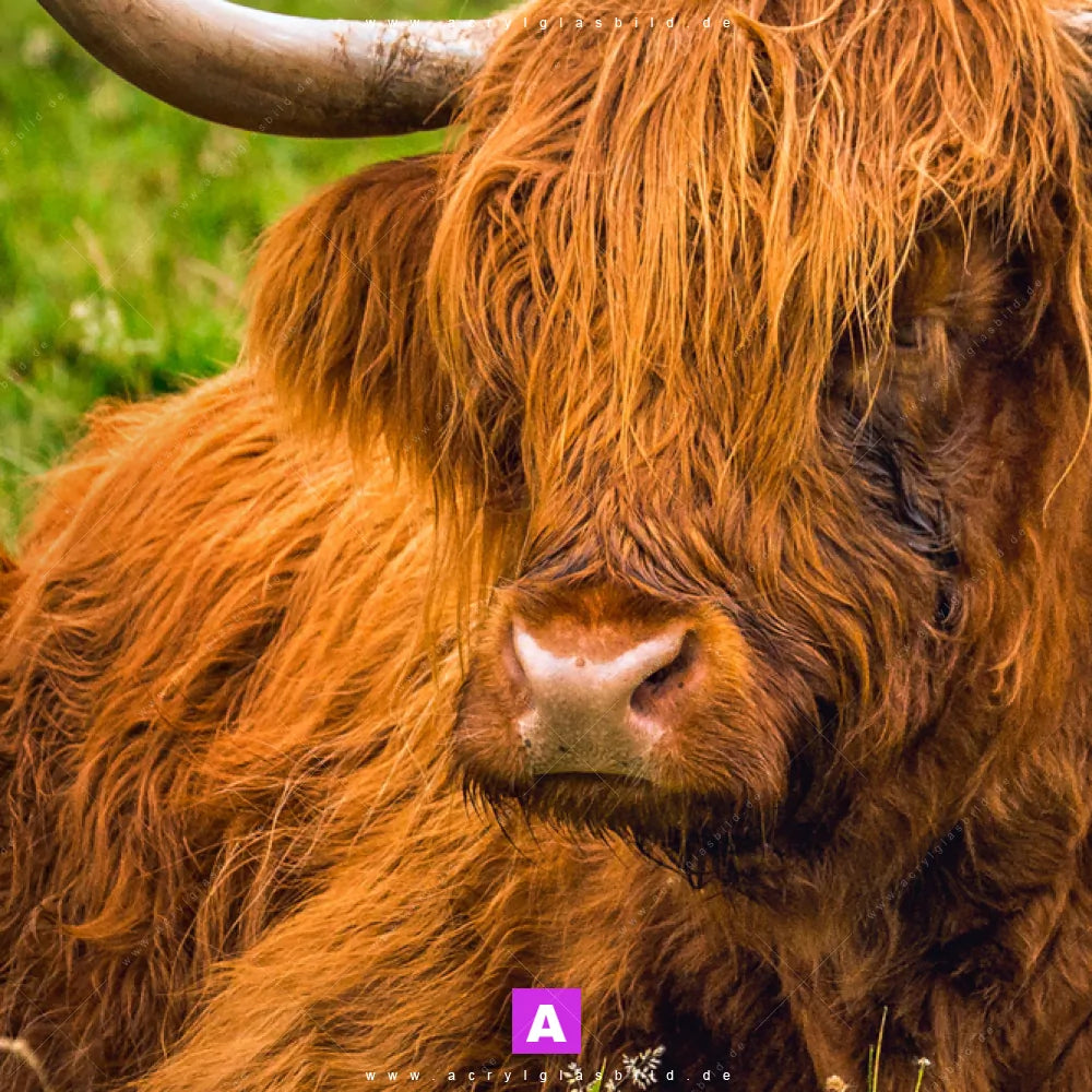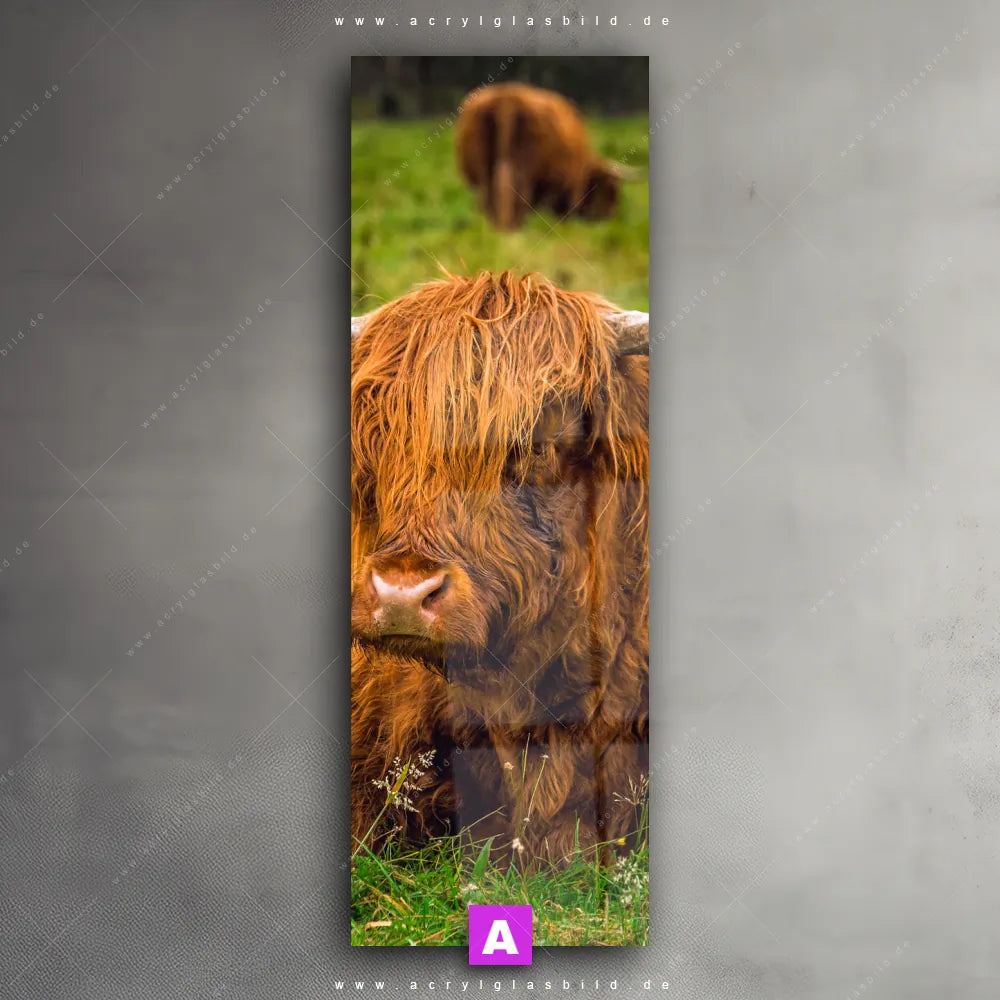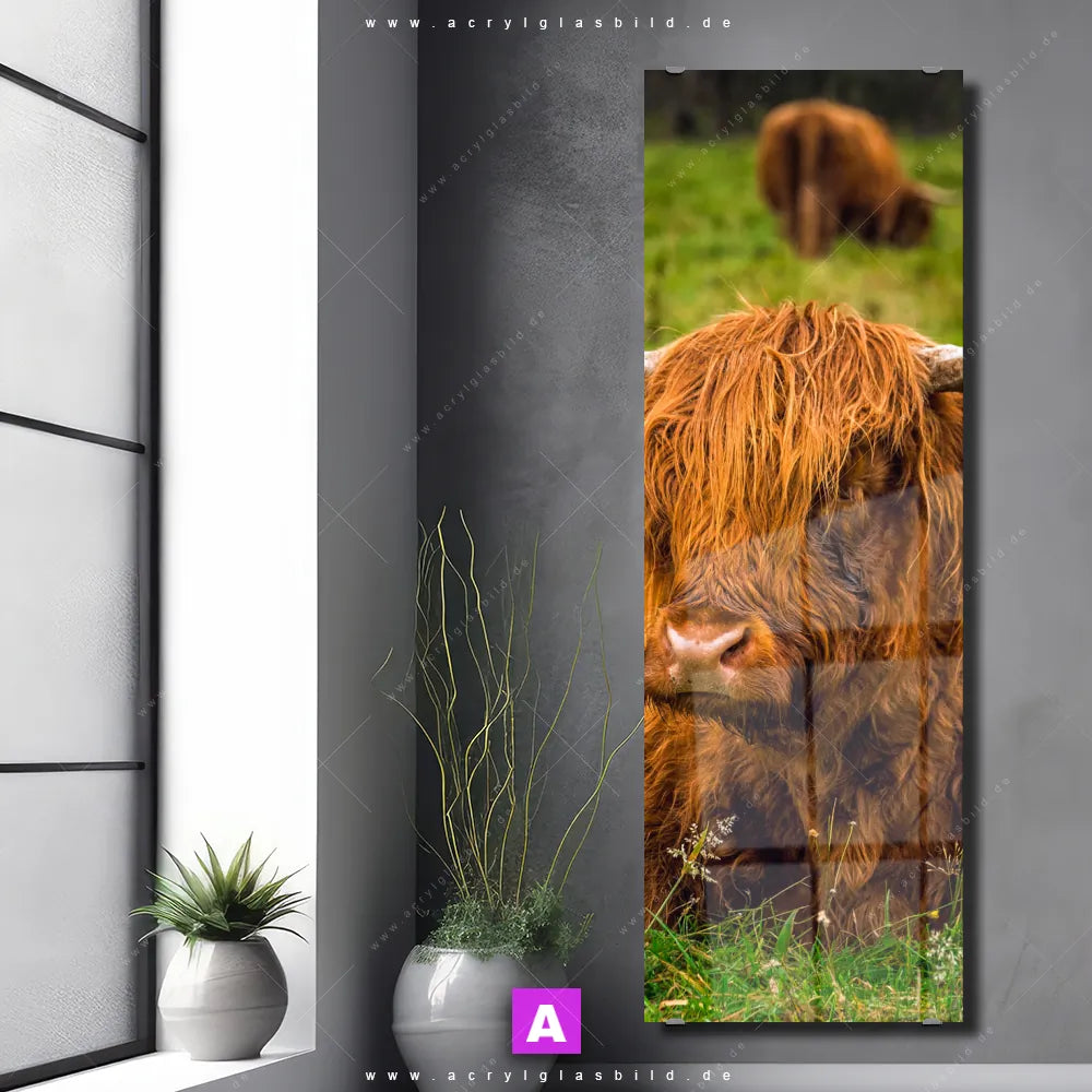 <b>Produktart:</b> Acrylglasbild | Glasbild | Wandbild aus Kunstglas | <b> Motiv:</b> Rind in den schottischen Highlands | <b> Bildausrichtung:</b> Schmal | <b> Max. Motiv-Größe:</b> 360cm breit | 240cm hoch | <b> Verfügbare Formate: </b> Quadrat, Querformat, Hochformat, Panorama, Schmal, Rund | <b> Kategorie:</b> Tierwelt | <b> Farben:</b> Braun, Grün | <b> Kunstformen:</b> Fotografie | <b> Kunststile:</b> Modern Art, Natürlich - Realistisch