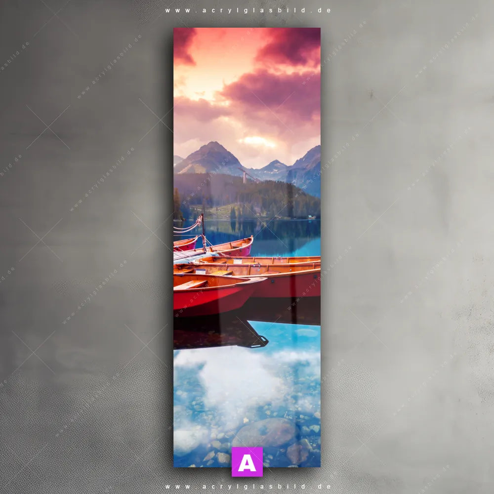 <b>Produktart:</b> Acrylglasbild | Glasbild | Wandbild aus Kunstglas | <b> Motiv:</b> Ruhiger Bergsee | <b> Bildausrichtung:</b> Schmal | <b> Max. Motiv-Größe:</b> 450cm breit | 300cm hoch | <b> Verfügbare Formate: </b> Quadrat, Querformat, Hochformat, Panorama, Schmal, Rund | <b> Kategorie:</b>  Landschaften | <b> Farben:</b>  Orange, Blau, Rot | <b> Kunstformen:</b>  Fotografie, Digitale Kunst | <b> Kunststile:</b>  Natürlich - Realistisch, Mixed Media